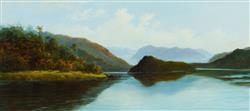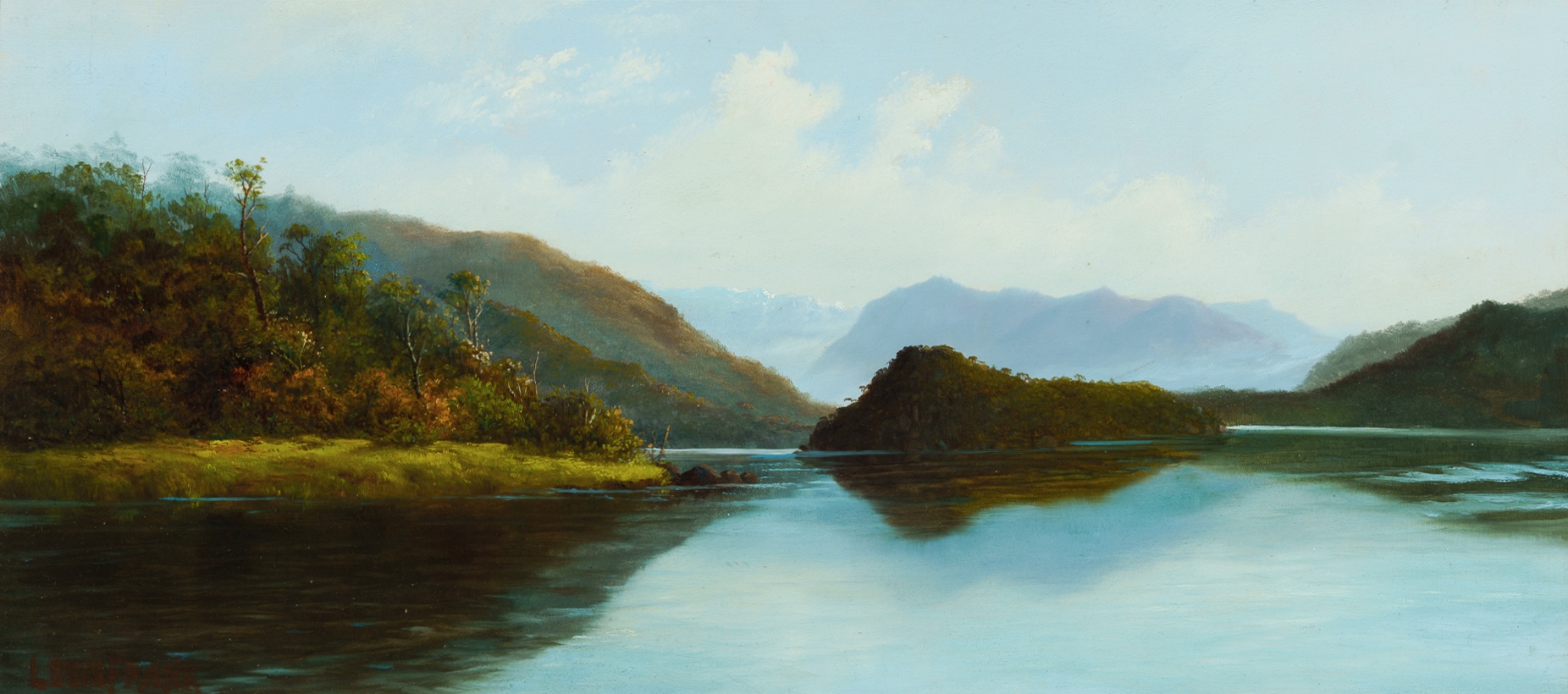 FRANK, Louis (c.1830-1923) New Zealand Lake with View to Mountains Signed lower left. Oil on Board 27x60cmEstimate $150-300