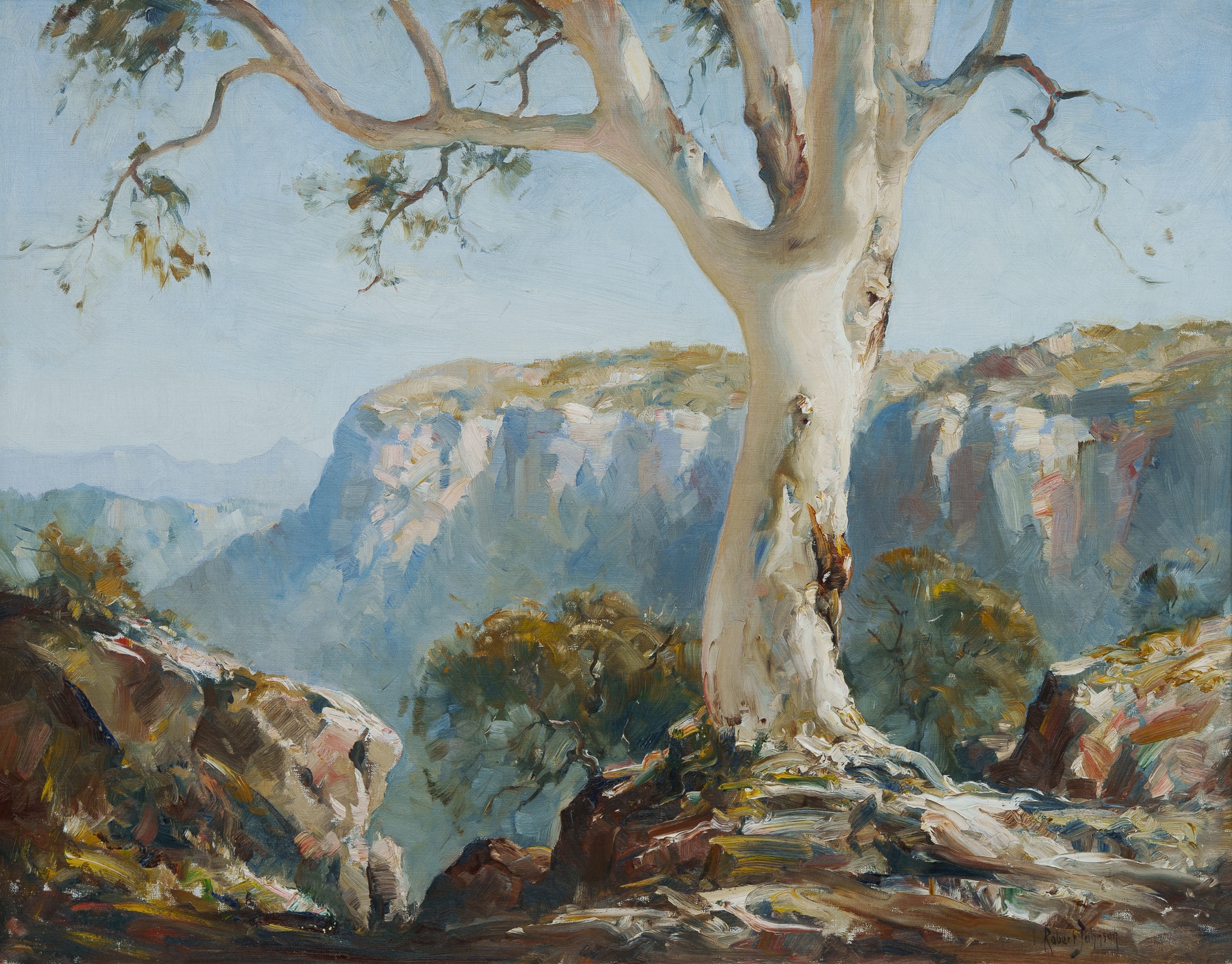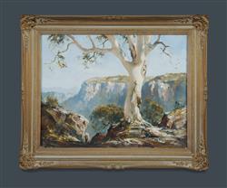 JOHNSON, Robert (1890-1964) 'Capertee Mountains,' 1959. Signed lower right. Accompanied by original invoice from Artlovers, Sydney, and a letter from Robert Johnson dated 10th February 1963. Oil on Canvas 70x90cmEstimate $2,000-3,000