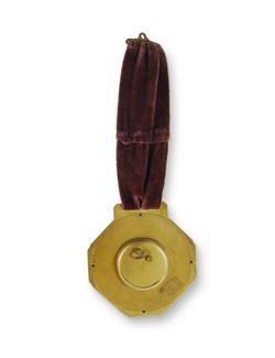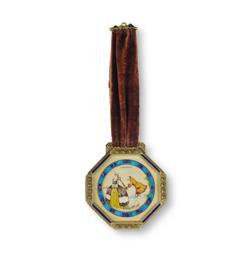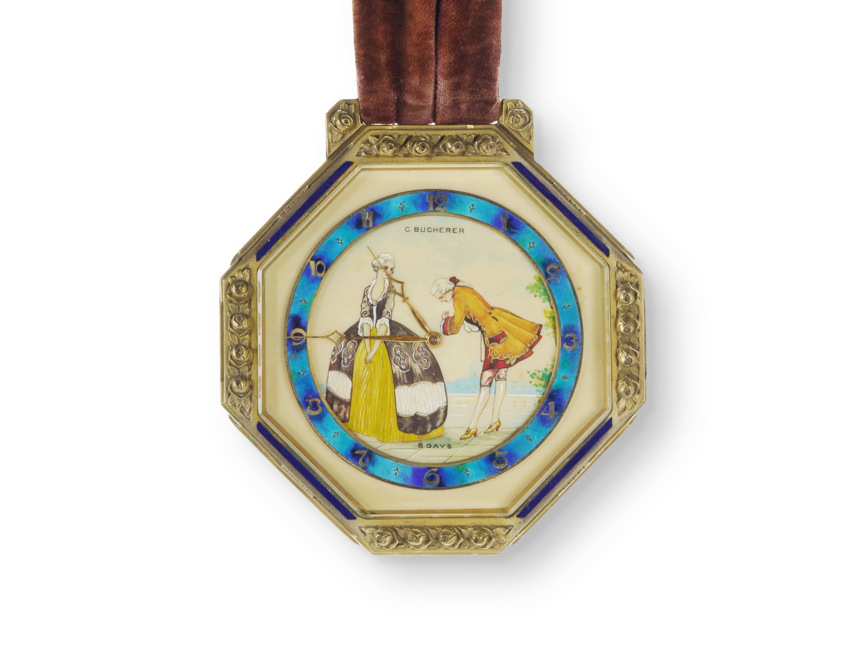 Carl Bucherer 8 Day Clock Hand-painted with an enamel dial. Running. On a brown velvet hanger (12x12cm)Estimate $1,000-2,000