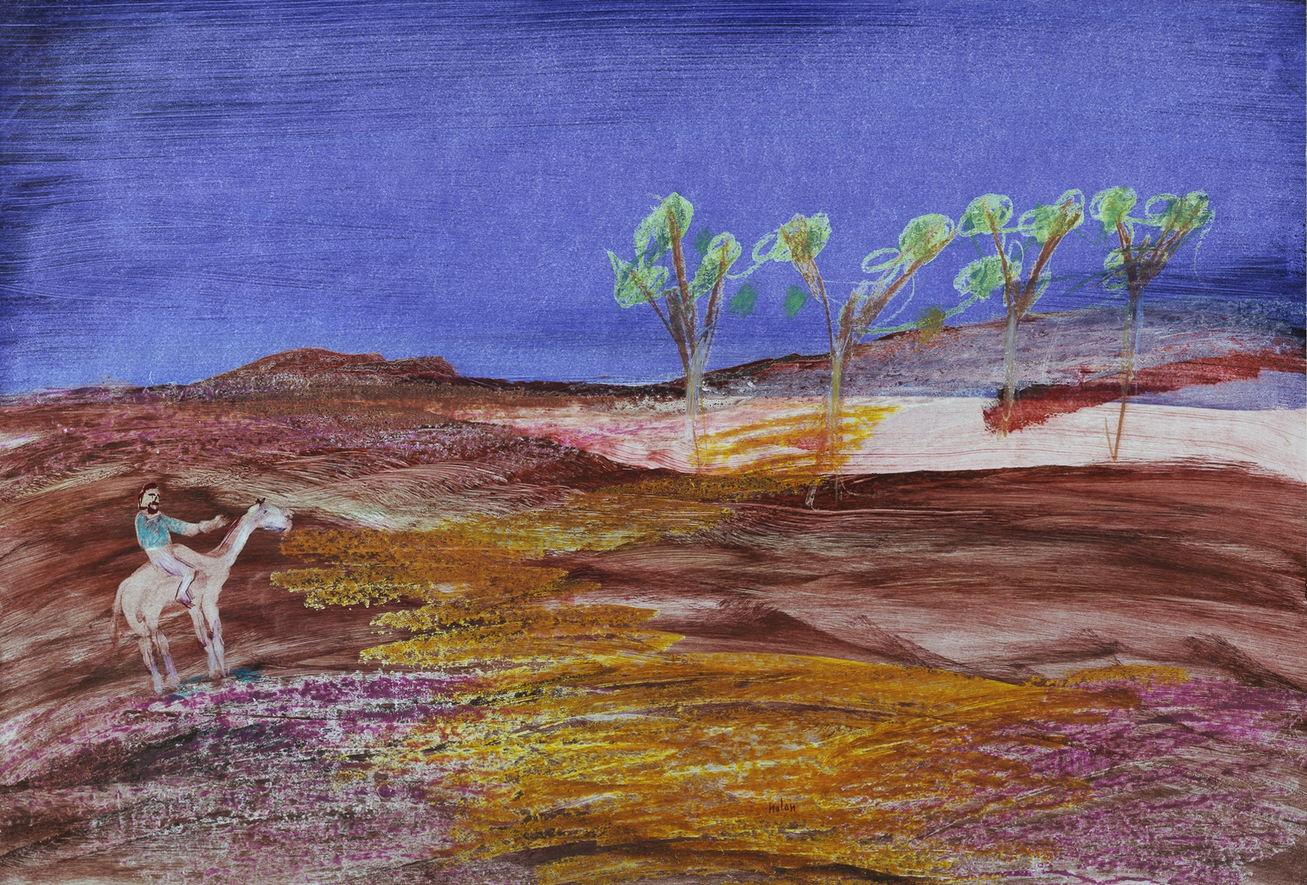 NOLAN, Sidney (1917-1992) 'Burke at the Oasis' Signed Nolan lower centre. Ripolin & Crayon 52x76cm PROVENANCE: Ken Hinds Cultural Heritage Collection, Qld. EXHIBITIONS: Caloundra Regional Art Gallery, 'Privately Collecting, Ken Hinds Cultural Heritage Collection,' Feb - Mar 2006 (catalogue included)Estimate $8,000-12,000
