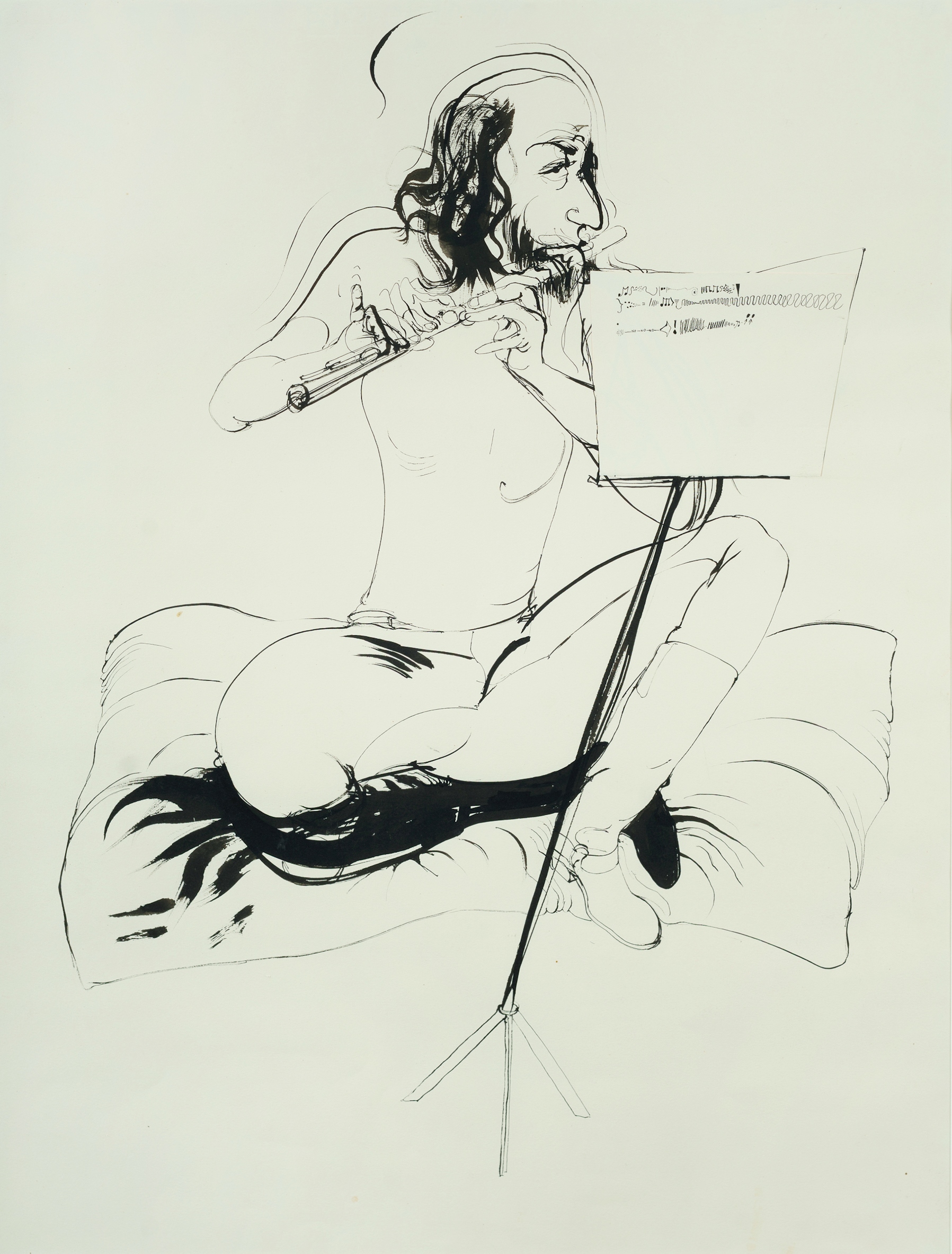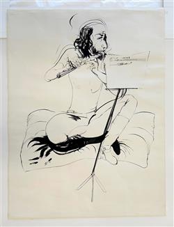 WHITELEY, Brett (1939-1992) 'Joel Elenberg Playing the Flute,' c.1975/6. Unsigned Ink on Paper with Collage 65x49cm (sight) 66x50cm (sheet) PROVENANCE: Christie's, Melbourne, November 25th 1997 (lot 201); Ken Hinds Cultural Heritage Collection, Qld. EXHIBITIONS: Caloundra Regional Art Gallery, 'Privately Collecting, Ken Hinds Cultural Heritage Collection,' Feb - Mar 2006 (catalogue included) LITERATURE: Sutherland, K., Brett Whiteley: Catalogue Raisonné, Schwartz Publishing, Melbourne, 2020, vol.7, p.320 (referenced in cat. 27.75) OTHER NOTES: © Wendy Whiteley/Copyright Agency, 2025.Estimate $45,000-65,000