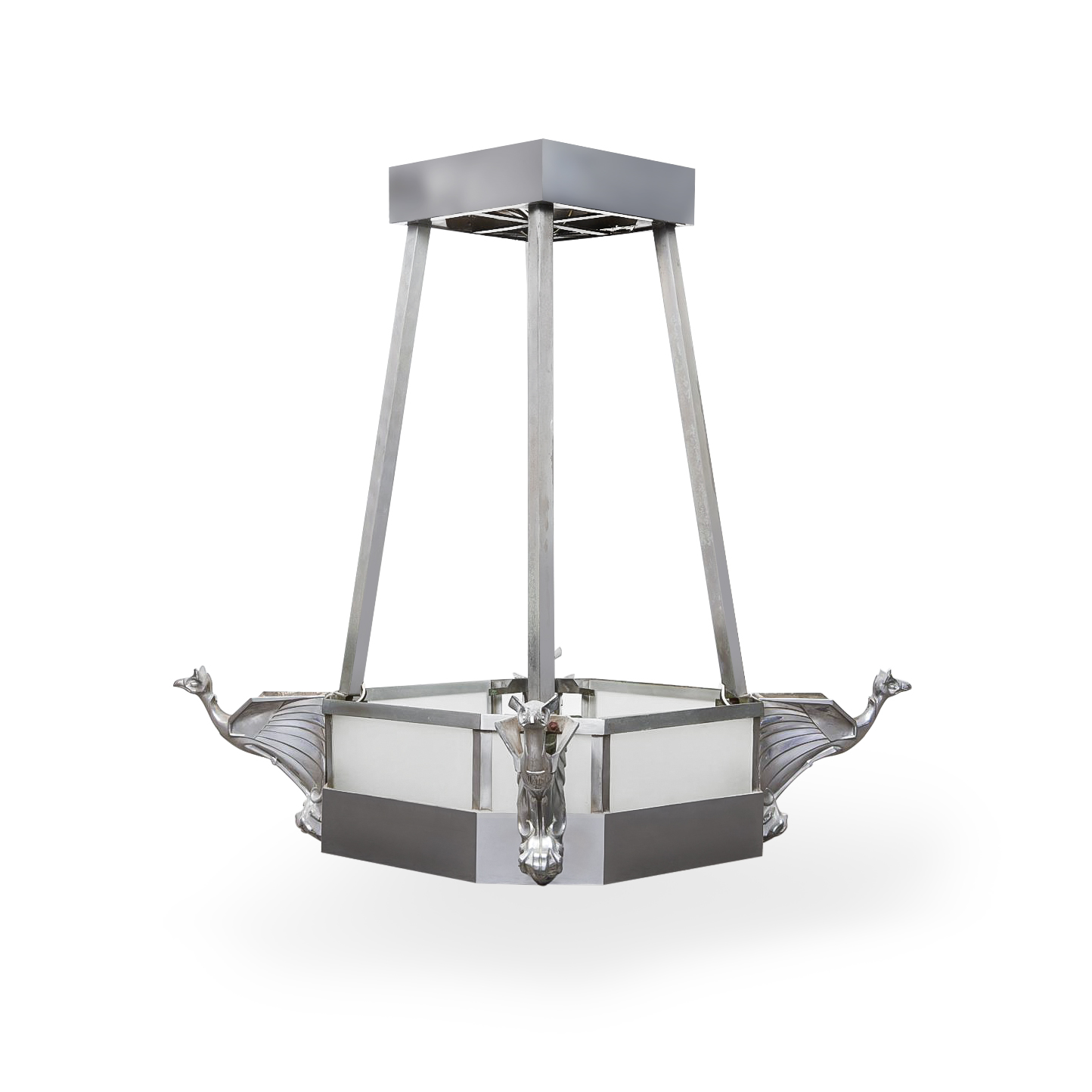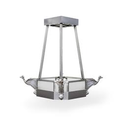 Le VERRIER, Max (French 1891-1973) Three Art Deco Light Fittings Including pendant light (78x59x59cm); and a pair of wall sconces (H23 W32cm D17cm). Each with chromed finish.