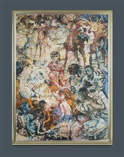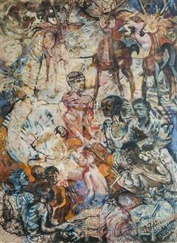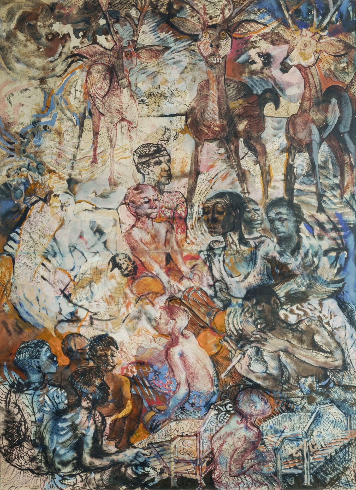 FRIEND, Donald (1915-1989) 'Bali, Gamelan with Deer Effigies' Signed and titled lower left. Ink & Mixed Media on Paper (in 4 joined parts) 147.5x107.5cm PROVENANCE: Geoff K. Gray, Sydney, 13th February 1974, lot 101 (sold as 'Magic Island')Estimate $12,000-18,000