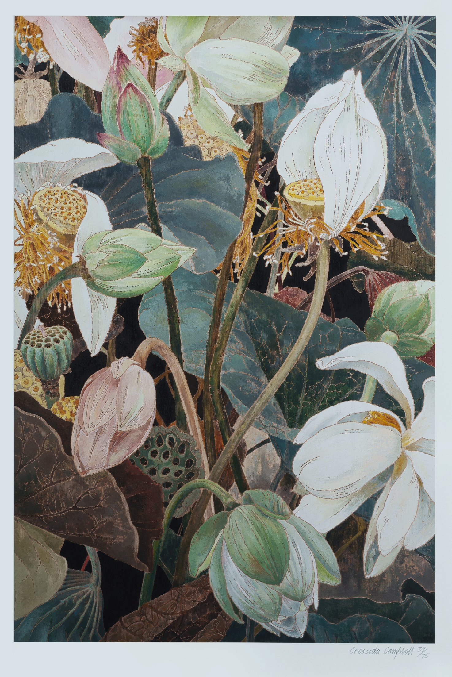 CAMPBELL, Cressida (b.1960) 'Lotus, 2019' This limited edition issued by the National Gallery of Australia in 2022, hand signed by the artist in pencil lower right. Blind stamp for NGA, and accompanied by certificate of authenticity. Pigment Ink Print on Cotton Rag Art Paper 39/75 65x43.5cm (image) 74x52.5cm (sheet, sight)