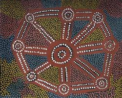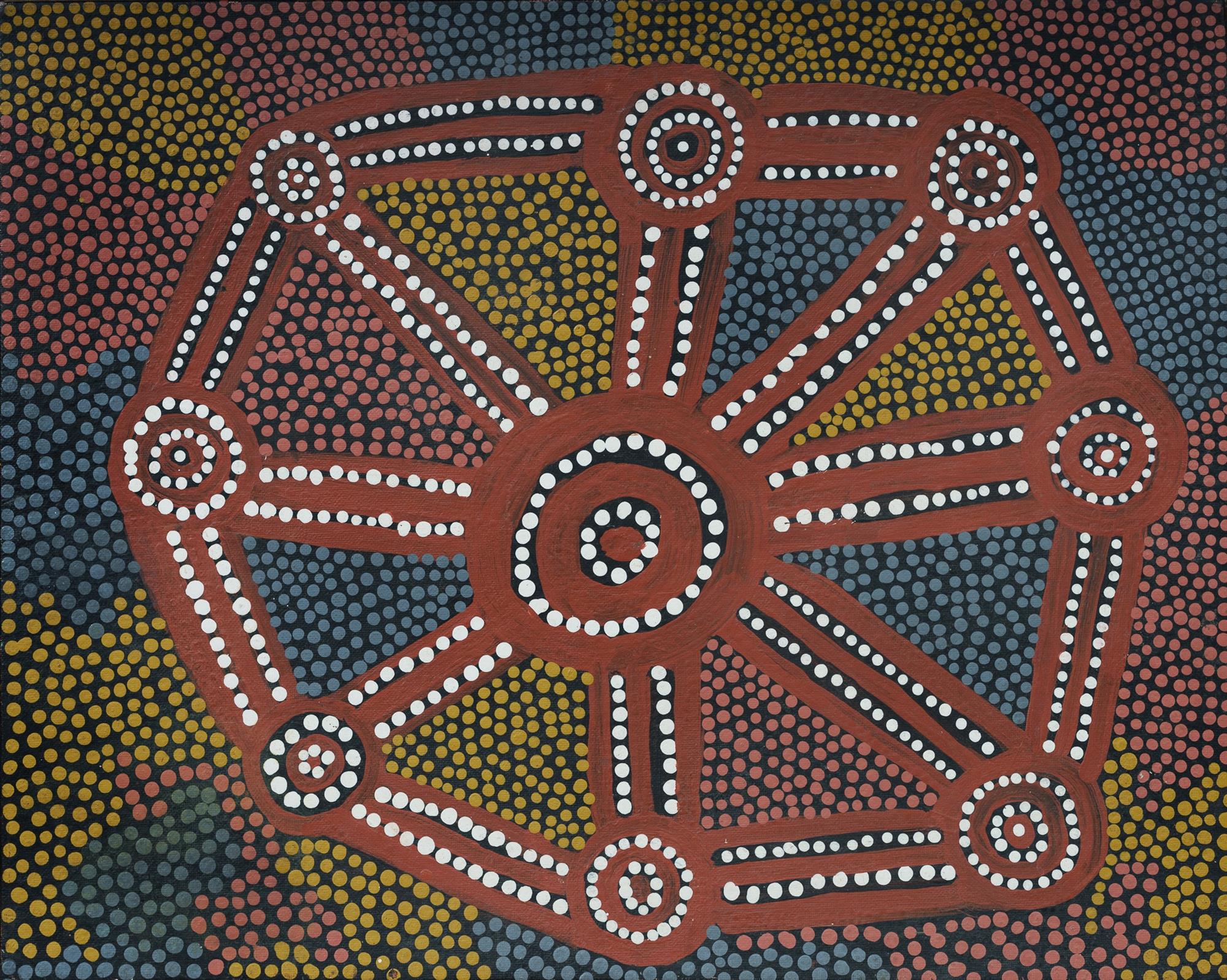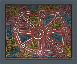 TJAPALTJARRI, Billy Stockman (Aboriginal 1927-2015) 'Man's Dreaming,' c.1978. Copious details inscribed verso. Acrylic on Canvas Board 40.5x50.5cm PROVENANCE: Ken Hinds Cultural Heritage Collection, Qld.Estimate $600-1,000