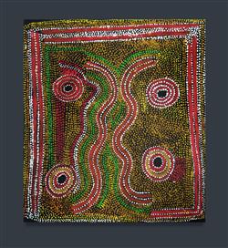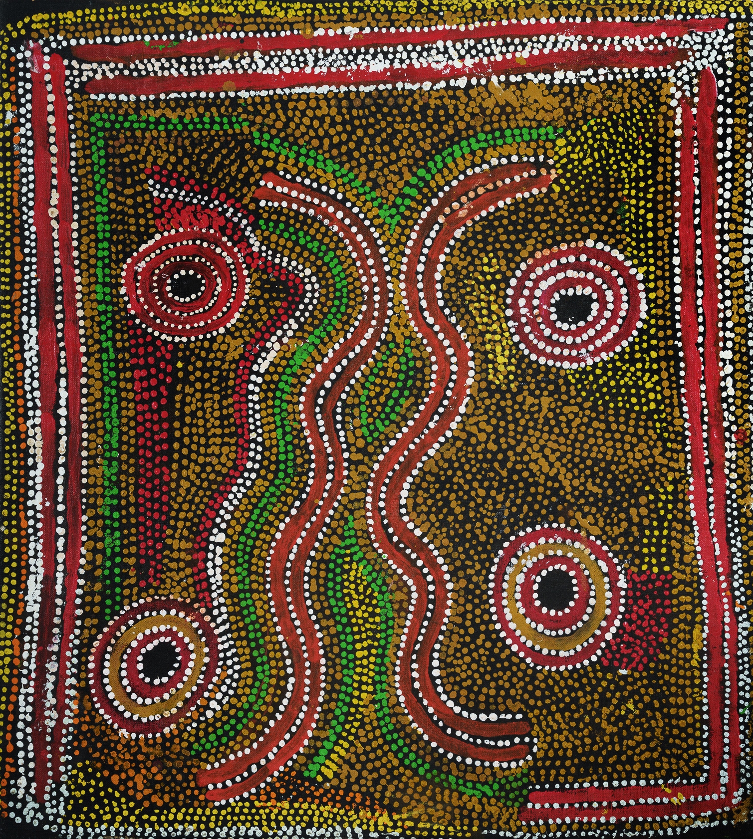 TJAPALTJARRI, Paddy Sims (Aboriginal c.1916-2010) 'Wati Jukurrpa, 1996. Acrylic on Linen 61x55cm PROVENANCE: The artist; private collection, NSW (purchased from the above); Lawson-Menzies, November 22nd 2006 (lot 463); Ken Hinds Cultural Heritage Collection, Qld.Estimate $500-800