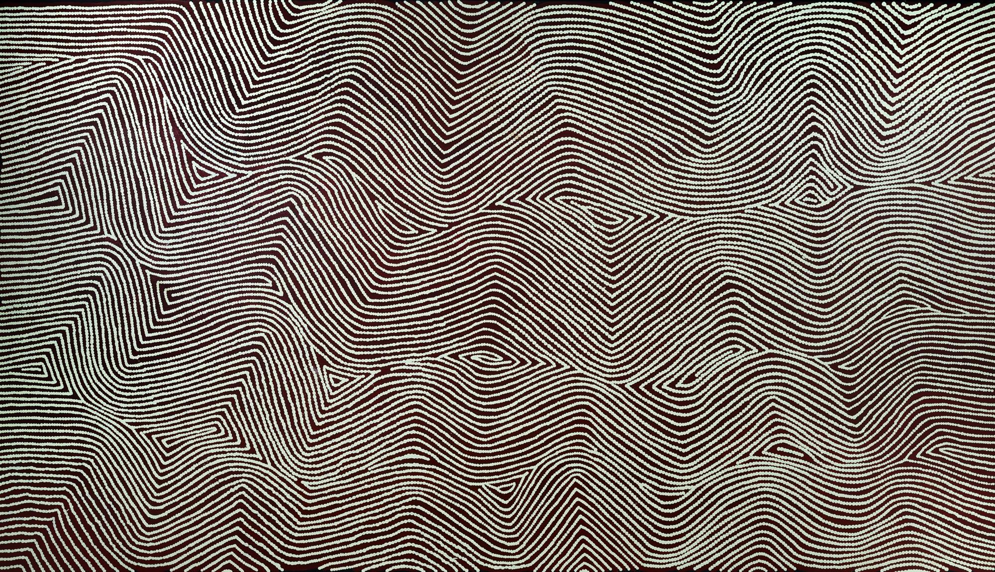 TJAPALTJARRI, Warlimpirrnga (Aboriginal born c.1950) Untitled, 2003. Acrylic on Linen 213x122cm PROVENANCE: Yanda Aboriginal Art (stamp verso), cat #200305; Ken Hinds Cultural Heritage Collection, Qld.Estimate $10,000-15,000