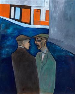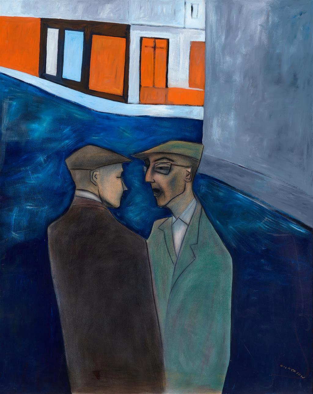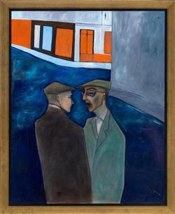 DICKERSON, Robert (1924-2015) 'The Morning News,' 1997. Signed lower right; inscribed with title verso. Oil, Acrylic, & Pastel on Paper on Canvas 150x120cm PROVENANCE: Private collection, Melbourne; Deutscher-Menzies, Sydney, December 8th 2004 (lot 52); private collection, Sydney; Lawson-Menzies, Sydney, July 17th 2005 (lot 21); private collection, Sydney; Menzies, Sydney, June 23rd 2011 (lot 17); private collection, Sydney; Lawsons, Sydney, March 24th 2022 (lot 510); private collection, NSW. EXHIBITIONS: Savill Galleries, 'Robert Dickerson,' April 2 - 30, 2000, Melbourne (label verso)Estimate $20,000-30,000