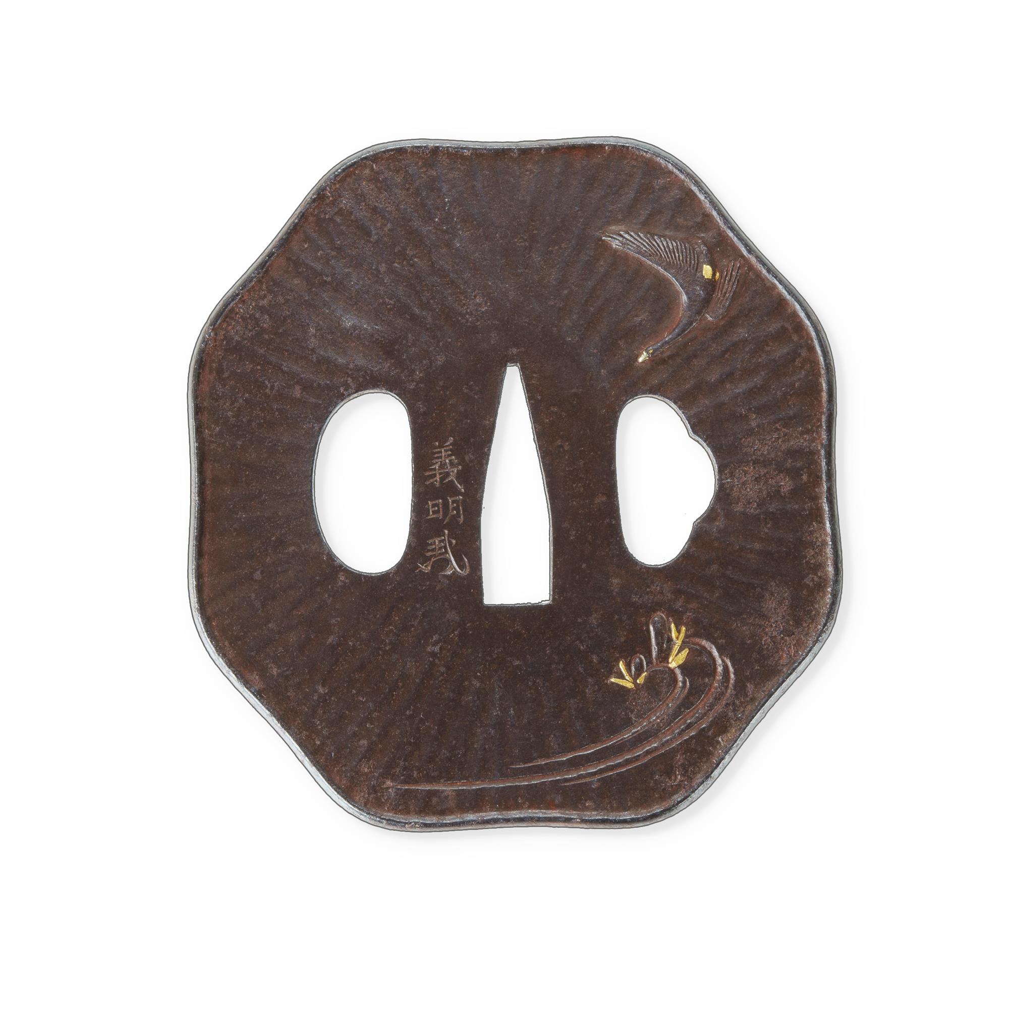 Japanese Edo Period Iron Tsuba by Yoshiaki Octagonal form, with low relief swooping crane over a stream. Signed 'Yoshiaki' with kakihan. Fine incised calligraphy verso, with traces of gold inlay. Deep brown chocolate patina.