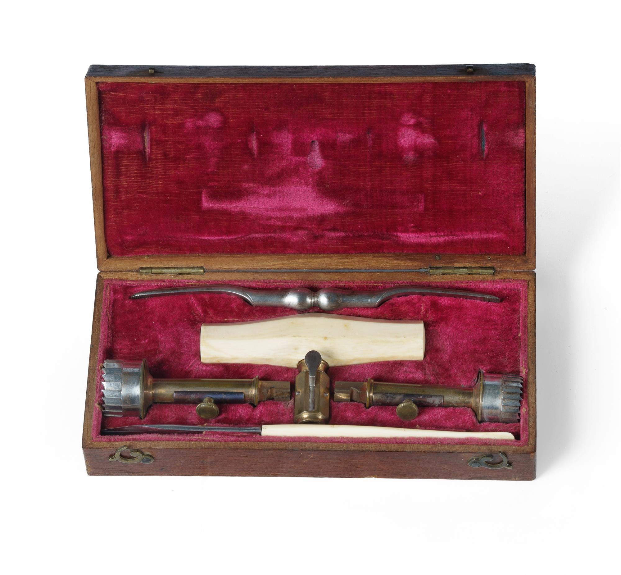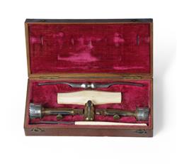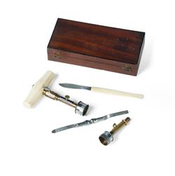 18th/19th C Cased Trephine Set By Samuel Laundy & Son (active 1783-1844) Includes a detachable ivory handle, 2 trephines, and an ivory-handled scalpel. In a fitted velvet-lined mahogany case. NB: ivory export restrictions. (18x8.5x3.5cm)