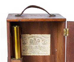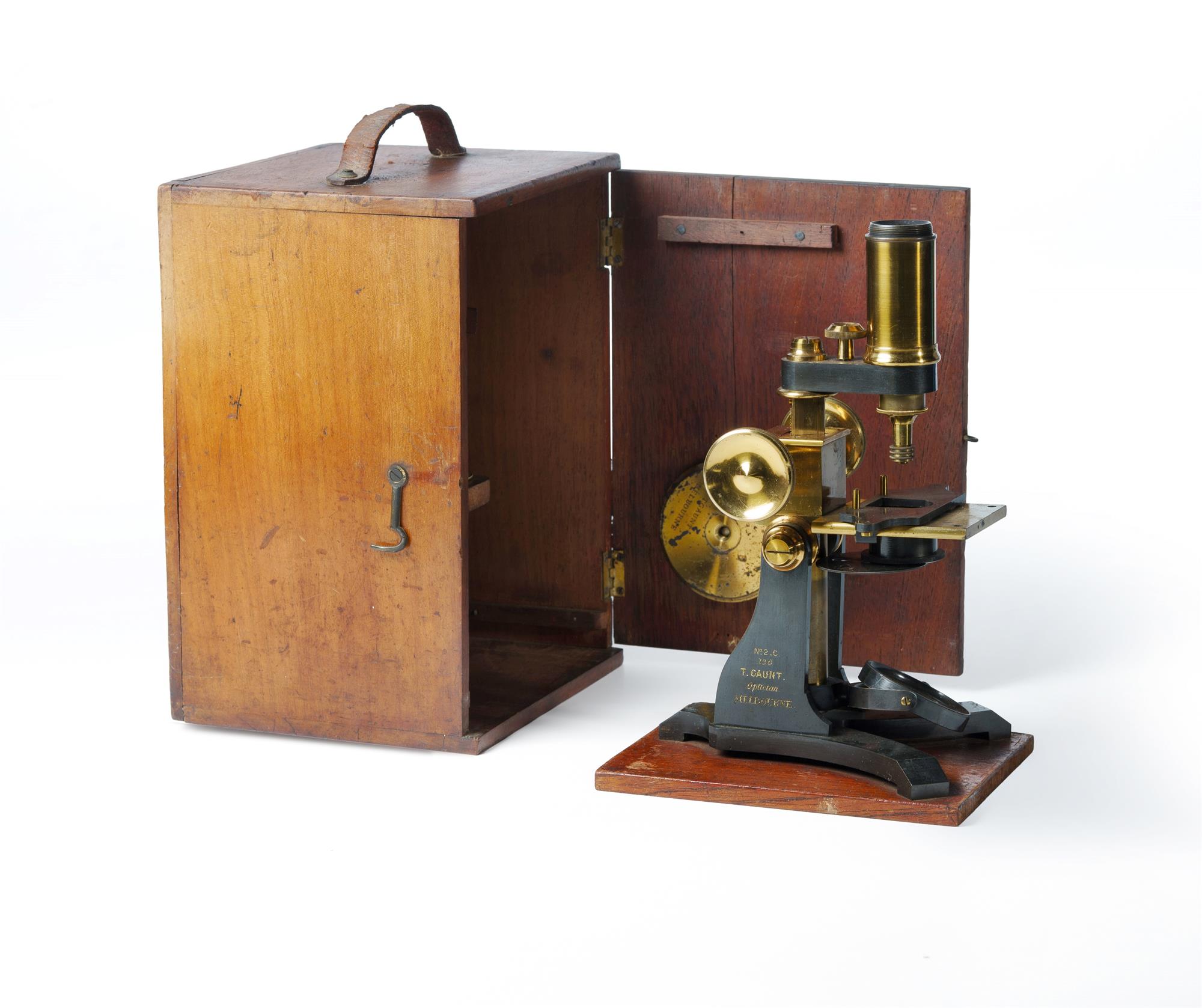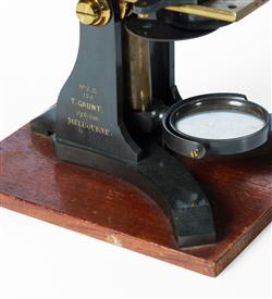 19th C Thomas Gaunt Microscope In timber case. Inscribed No.2-C 136 T. Gaunt, Optician Melbourne. 28x20x17cm (case) PROVENANCE: Collection Late Kenneth F. Russell (1911-1987), Professor of Anatomy and Medical History, University of Melbourne.Estimate $400-800