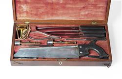 Early 19th C Cased Surgical Instrument Set In a fitted velvet-lined mahogany case. Including bone saw, scalpels, trephine etc. With ebony handles. 42x20.5x6.5cm (case)