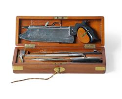 Cased Set of 19th C Post-Mortem Instruments In a fitted, brass bound mahogany case. 32x11x7cm (case) PROVENANCE: Collection Late Kenneth F. Russell (1911-1987), Professor of Anatomy and Medical History, University of Melbourne.Estimate $100-200