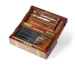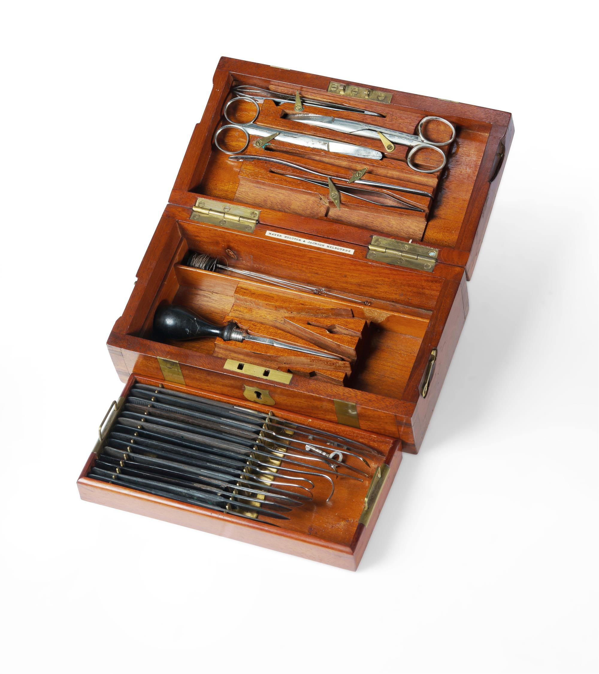 Minor Operating Surgical Instrument Set In a fitted two-tier brass bound mahogany case, by Mayor, Meltzer & Jackson, Melbourne, circa 1900. Ebony handles. (23x12.5x8.5cm)