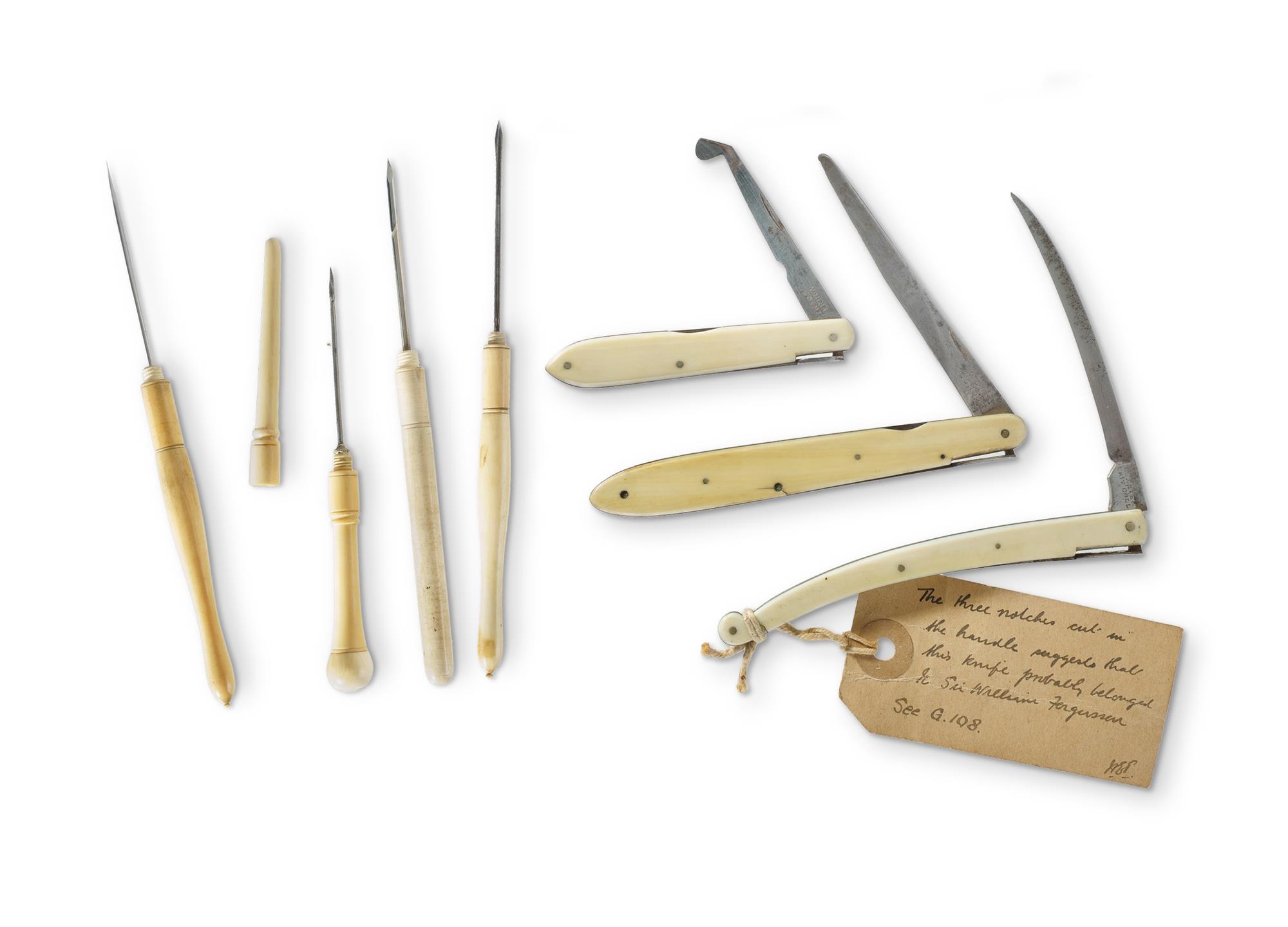 7 Various 19th C Medical Instruments Including gum lancet by Young of Edinburgh (L13cm); curved bistoury by Coxeter & Son of University College, bears hand-written note suggesting it belonged to famed surgeon Sir William Fergusson (L19cm); bistoury by Weiss of London (L19cm); and 4 exploring needles in ivory cases. NB: ivory export restrictions.