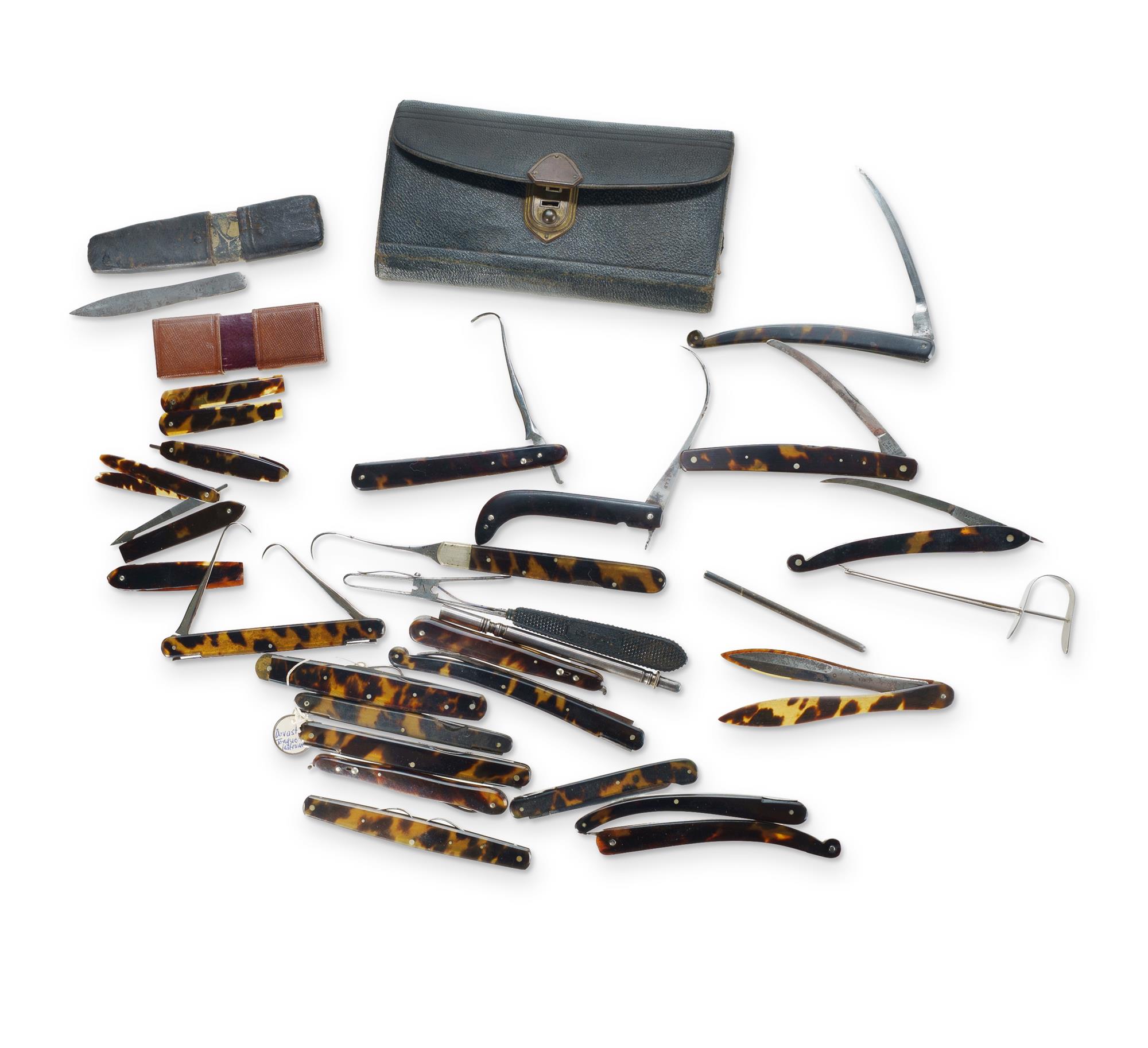 Various 19th C Lancets, Cannula, Needles and Forceps. Many with tortoiseshell covers (NB: tortoiseshell export restrictions). Together with a folding leather instrument case. Various makers.