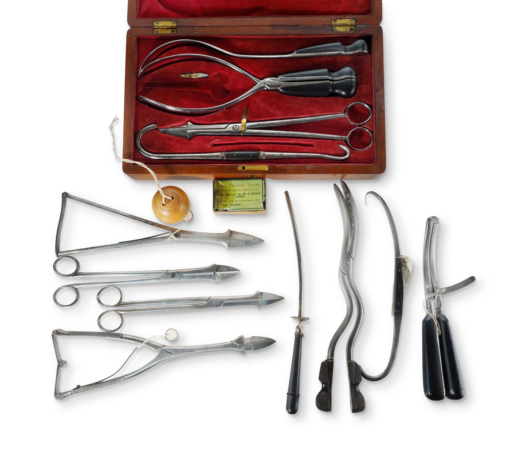 19th C Midwifery Set in Mahogany Case Together with a group of various midwifery and gynaecology instruments. Most with ebony handles. 34x20x6.5cm (case)