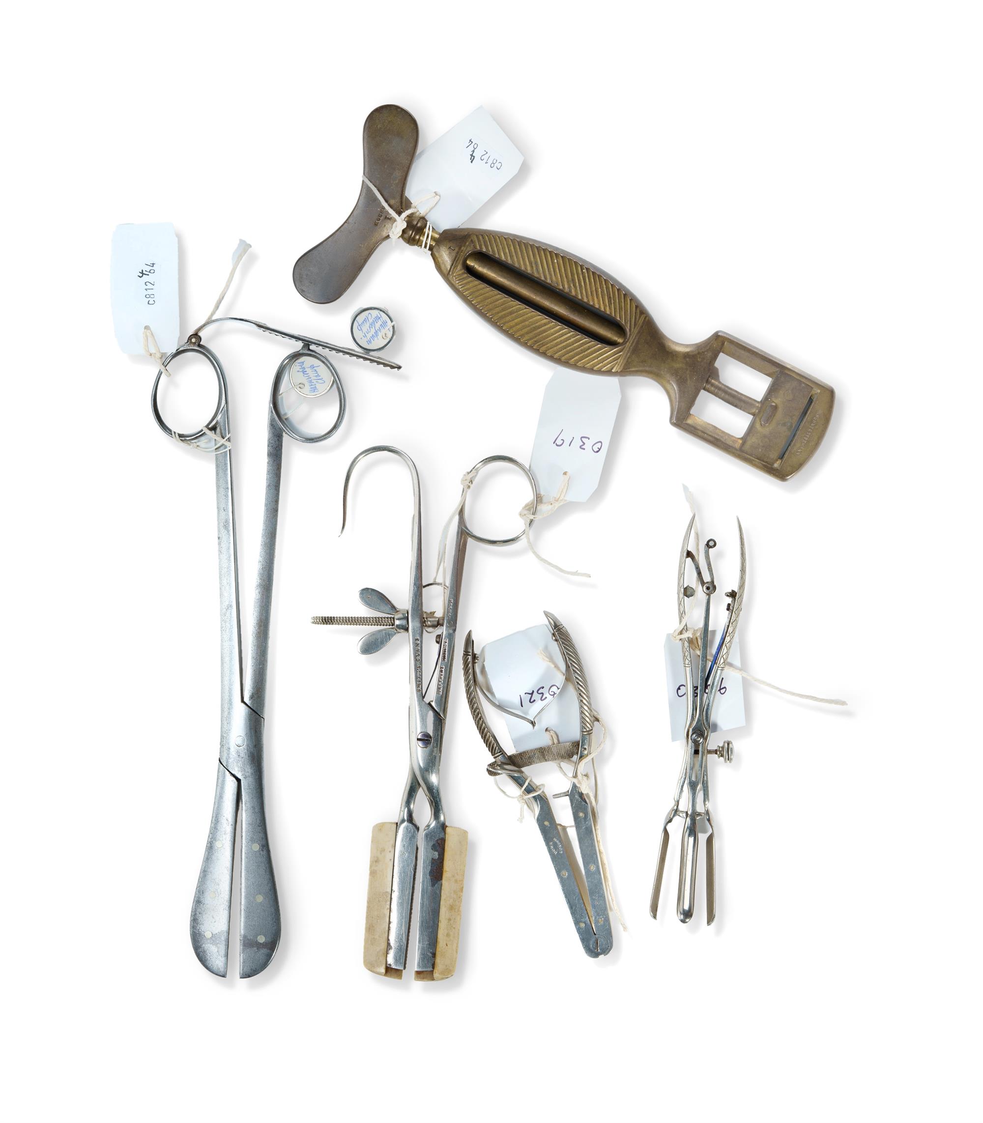 Rectum Speculum and 4 Various Haemorrhoid Clamps Including examples by Allingham, Smith, and Gowlland. PROVENANCE: Collection Late Kenneth F. Russell (1911-1987), Professor of Anatomy and Medical History, University of Melbourne.Estimate $80-150