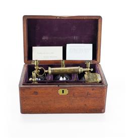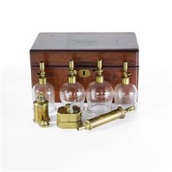 Mid 19th C Pneumatic Cupping Set, c.1860s. In fitted velvet-lined mahogany case, by Evans, John & Co. Comprising scarificator, spirit lamp, 4 glass 'cups' and air pump. 25.5x16x13cm (case)