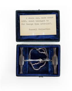 19th C Surgical Chainsaw Previously owned by Sir George Adlington Syme KBE. In a velvet-lined case (lid detached) (9.5x6.5x2cm)