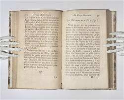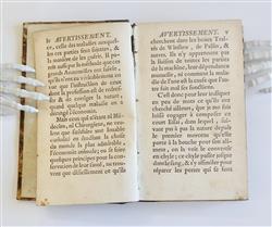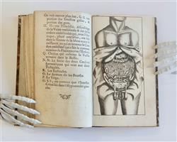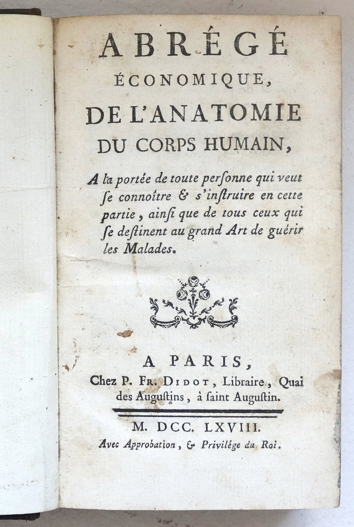 LE DRAN, Henri François (1658-1770) Abrégé Économique de l'anatomie du Corps Humain A la portée de taute personne qui veut se connoitre and s'instruire en cette partie, ainsi que de tous ceux qui se distinent au grand art de guérir les malades. Pub. PARIS: Chez P. Fr. Didot. Libraise. Qiai des Augustins, à Saint Augustian. MDCCLXVlll. (1768) Title, pp[iii]-vii [18] leaves. 259 pp. [4] leaves : 16 plates. (157x96mm) Published anonymously. Le Dran was a surgeon and a lithotomist. Best known for his book on military surgery and his operation for the stone.