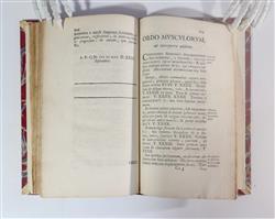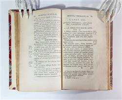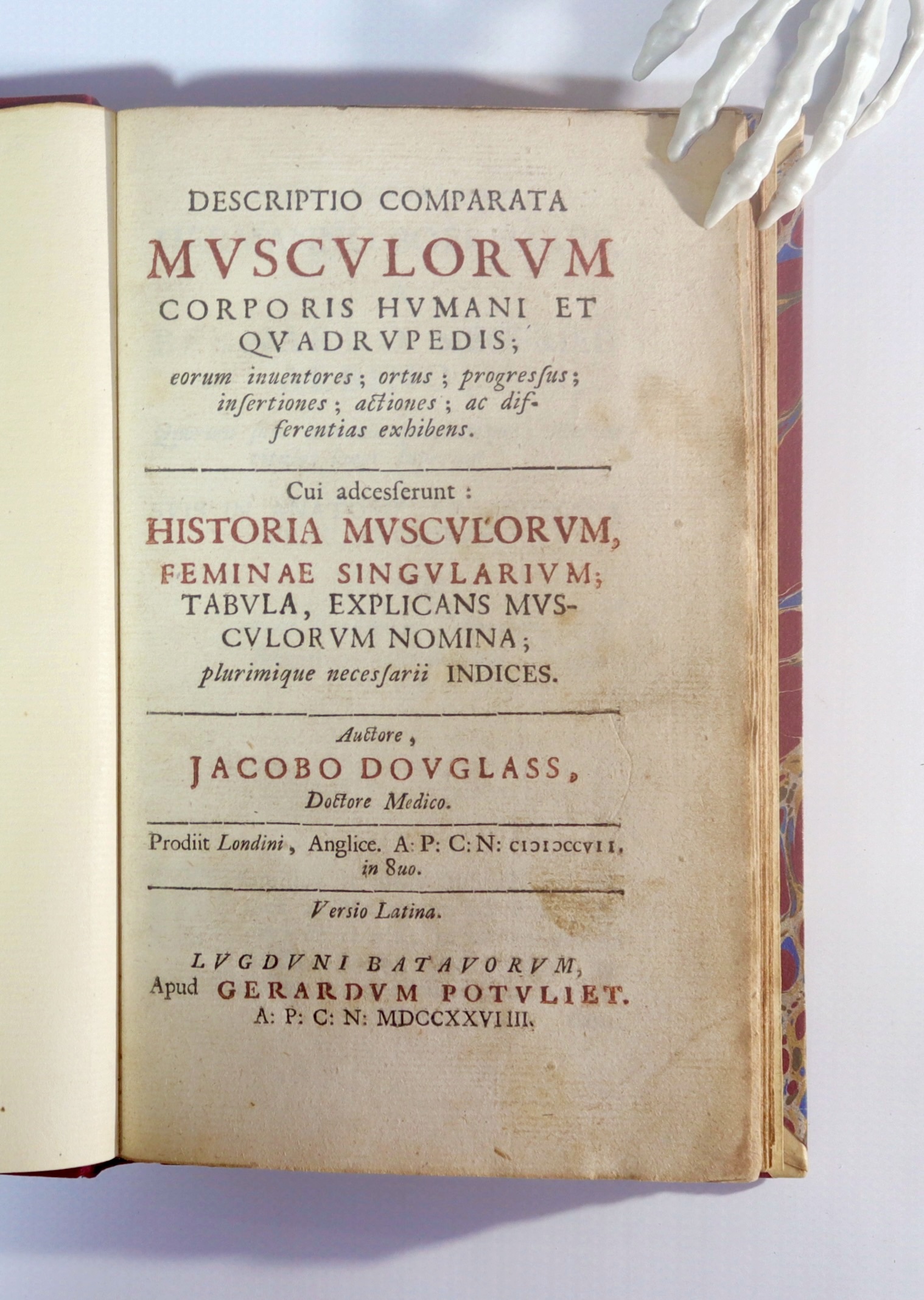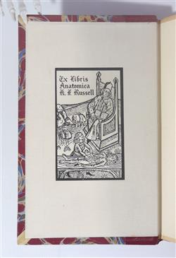 DOUGLAS, James. Discriptio Comparata Musculorum Corporis Humani et Quadrupedis: eorum inuentores; ortus; progressus; insertiones; actiones; ac differtias exibens. Pub. LUGDUNI BATAVORUM (Leiden): Apud Gerardum Potuliet. MDCCXXVIIII [1729] pp. [16] 1-210 [2] (pages 92, 142, 151, 152, 156 misnumbered as 78, 242, 251, 252, 256). Douglas was a well known teacher of anatomy in London where he practised midwifery. He was responsible for William Hunter coming to London. Douglas is best known for his description of the pouch of Douglas in the peritoneal cavity. He wrote on the peritoneum and produced an excellent bibliography of anatomy. His book on the muscles was translated into Latin and Dutch. Rebound by Gray of Cambridge 1955 in quarto red morocco, marbled boards and vellum corners. This is the binding adopted by the Royal College of Surgeons for their rare books which require rebinding. Title page foxed, contents mostly very clean, binding good. Bookplate: Ex Libris Anatomica K.F. Russell. (192x118mm)