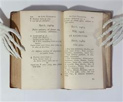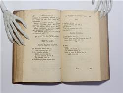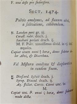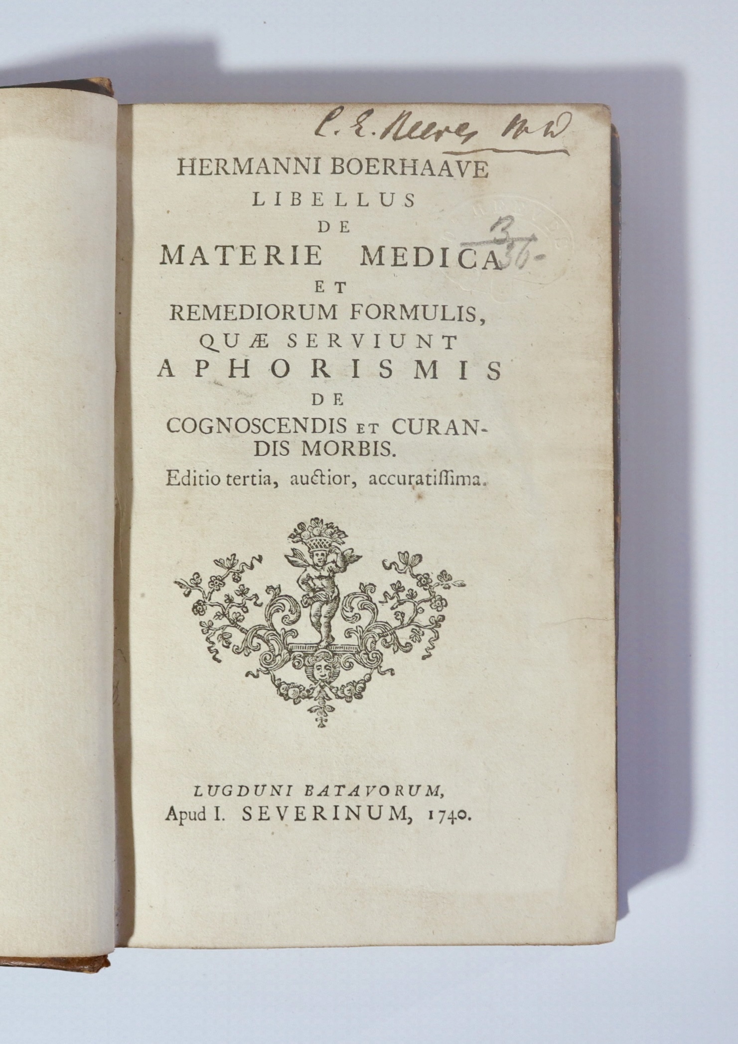 BOERHAAVE, Hermann. Libellus de Materie Medica et Remediorum Formulis, quae sersiunt Aphorismis de Cognoscendis et Curandis Morbus. Editio tertia, auctior, accuratissima. Pub. LUGDUNI BATAVORUM (Leiden) : Apud I. Severinum, 1740. Third edition 'enlarged and more accurate.' 276pp. + 44pp. Index. Hermann Boerhaave (1668-1738), the famous Dutch physician. A compilation of medicinal recipes which cover a wide range of subjects (rabies, cancer, rheumatism, catalepsy...) The aphorisms are a tribute to Hippocrates. Full polished leather binding with edge and corner wear. Preliminaries toned, though overall condition is very good. Occasional foxing, not overt. Ink signature of C.E. Reeves, Melbourne MD, book label for K.F. Russell. (161x100mm)