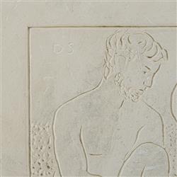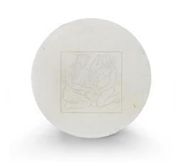 STRACHAN, David (1919-1970) 'The Lovers', initialled upper left; and 'Woman and Fish', unsigned. Incised Double-Sided Plaster Plaque Dia.31cm PROVENANCE: The Fred and Elinor Wrobel Collection, Sydney. Estimate $200-300