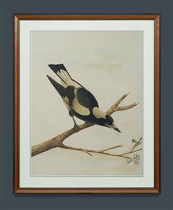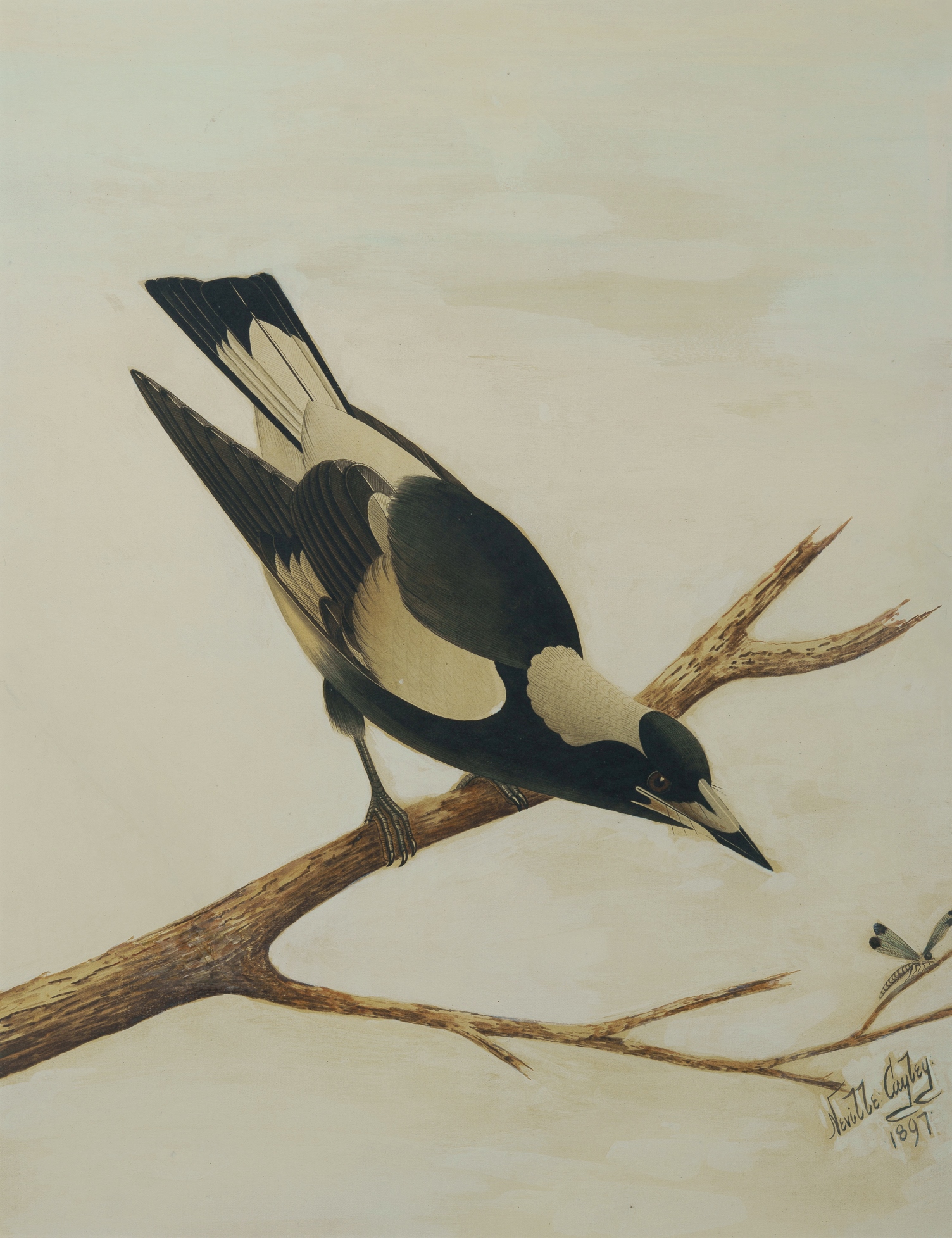 CAYLEY, Neville Henry (1853-1903) Magpie Stalking Dragonfly, 1897. Signed lower right. W/Clr 53.5x41cm