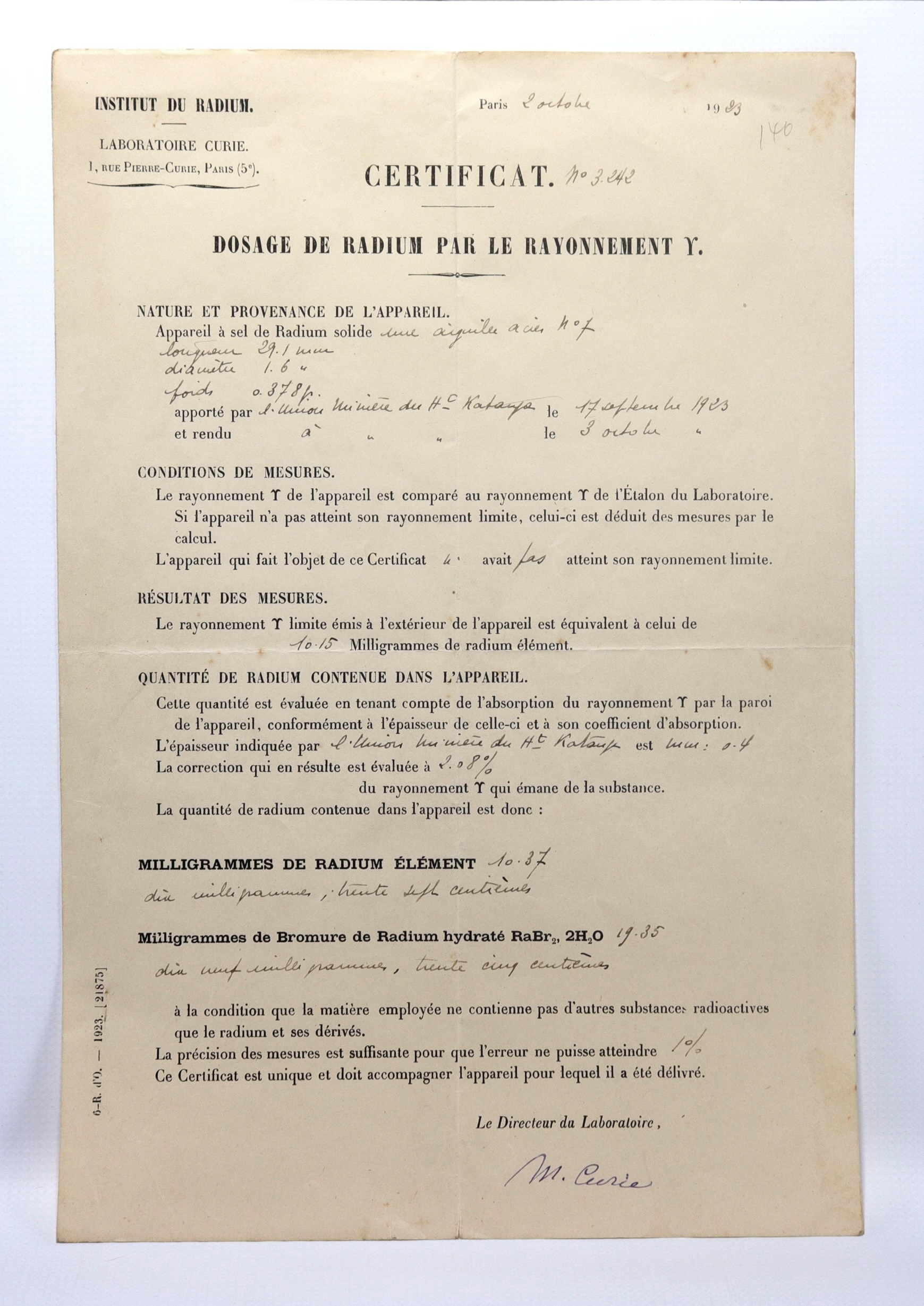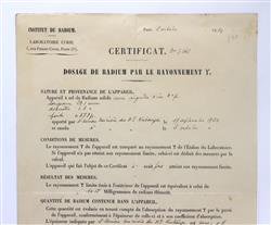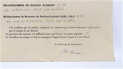 Marie CURIE Signed Certificate of Radium Analysis Single leaf 'Certificat' from the Institut du Radium, at 1 Rue Pierre-Curie, Paris. Dated October 2, 1923, this appears to be a definitive analysis of a mining sample which determines the amount of Radium and Radium Bromide. Signed 'M. Curie' in violet ink. Some foxing top RH corner, one spot mid RH margin, not overt. Old double fold lines. (310x206mm)