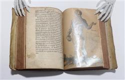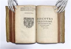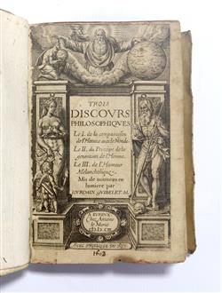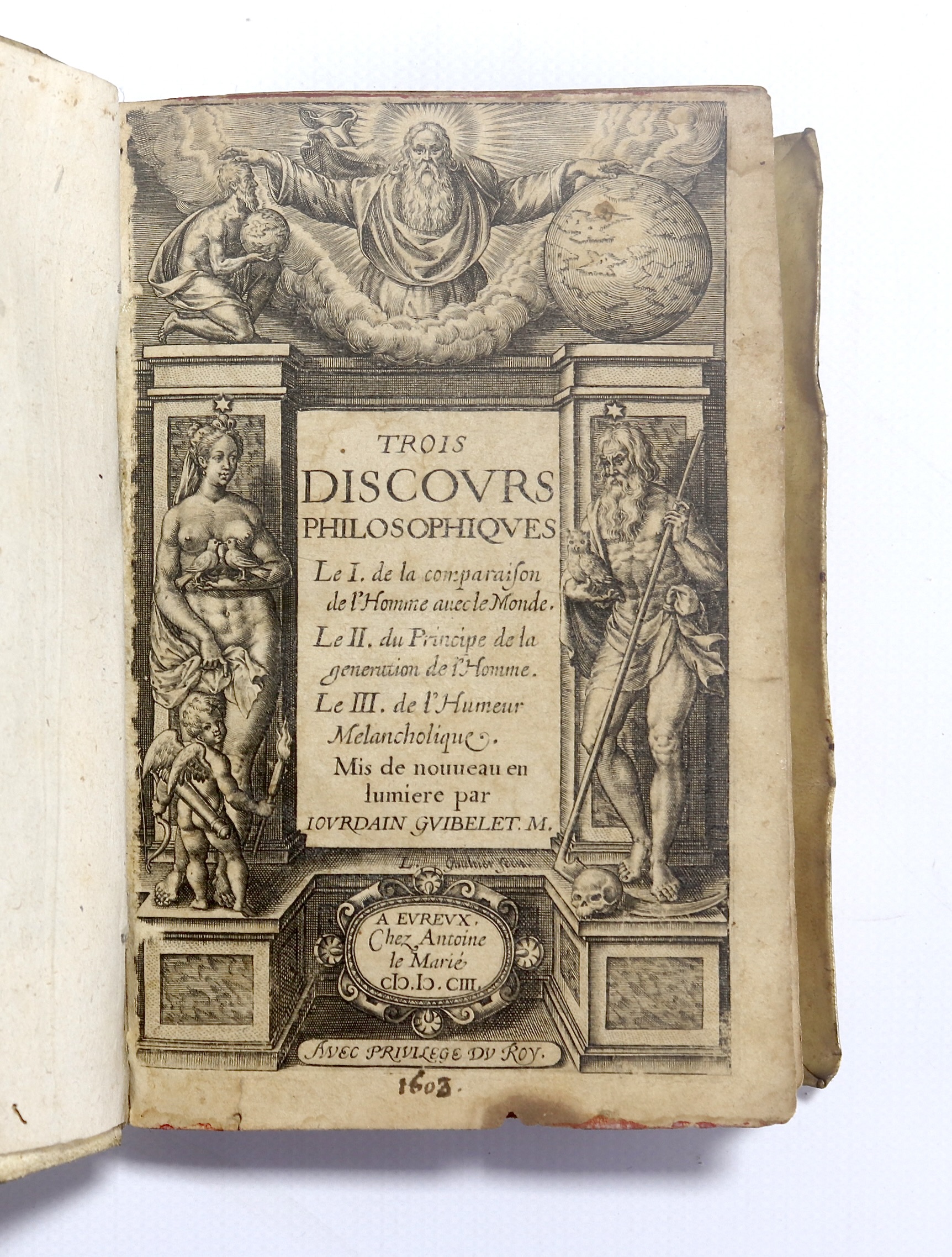GUIBELET, Jourdain. Trois Discours Philosophiques. Le I. de la camparaison de l'Homme avce le Monde. Le II. du Principe de la generation de l'Homme. Le III de l'Humeur Melancholique. Mis de noueau en lumier par Jourdain Guibelet M. Pub. A EVREUX: Chez Antoine le Marie, 1603. Avec privelege du Roy. [10]leaves, 286pp, [8]leaves. The two engraved plates, one showing the anatomy of man, and the other the anatomy of a woman are lacking, but supplied in photographic facsimile. Vellum binding is stained and worn. Engraved title with stain and chip to the bottom. Text toned but overall good. Has fairly frequent underlining plus very neat ink notatons. Bookplate: Ex Libris Anatomica K.F. Russell. (160x107mm)