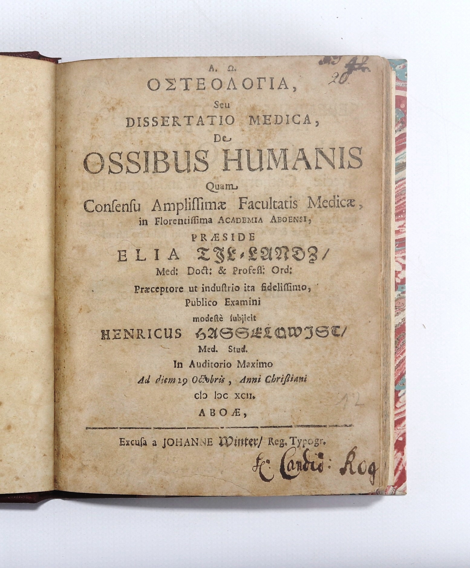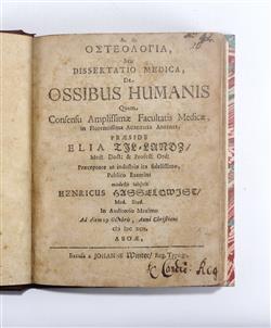 First Anatomical Book Printed in Finland TILLANDZ, Elias. A.O.S G seu Dissertatio Medica de Ossibus Humanis Quam Consensu Amphissimae. Facultatis Medicae in Floeentissima Academia Aboensi. Publisher, 'Excusa a Johanne Winter, Reg. Typogr', 1692. Title, [3] leaves, 87pp., :: 14 woodcuts. Elias Tillandz (1640-1693), later Tillander, was a Swedish born doctor and botanist in Finland. He was the professor of medicine at the Academy of Turku. He wrote the country's first botanical work, the Catalogus Plantarum, which was first published in 1673. As a doctor he also prepared medicines for his patients by using his extensive knowledge of plants. Bibliothoea Walleriana 9593 under Tillandz with see reference from Hasselquist. Later red quarter leather on marbled boards is in good condition. Text has offsetting and moderate foxing for age, Title and final text page the worst. Bookplate: Ex Libris Anatomica K.F. Russell. (181x142mm)