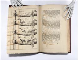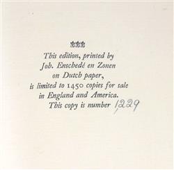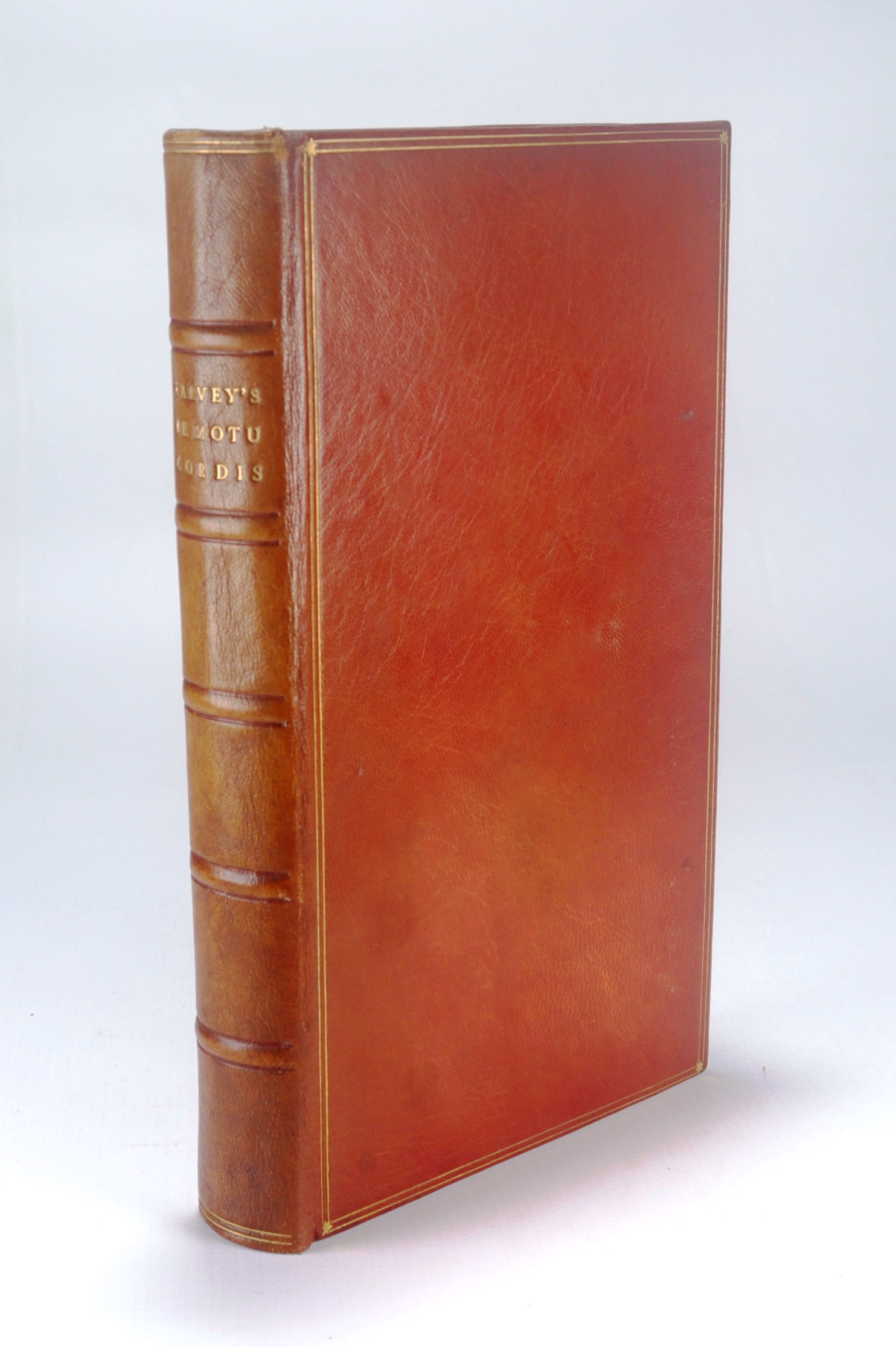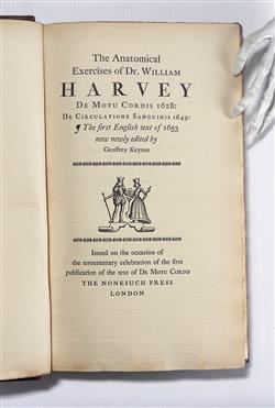 HARVEY William. Tercentenary Celebration of the First Publication of DE MOTU CORDIS. The Anatomical Exercises of Dr. William Harvey De Motu Cordis 1628: De Circulatione Sanguinis 1649: The first English text of 1653 now newly edited by Geoffrey Keynes. Pub. LONDON: The Nonesuch Press, [1928] Title, pp[iii]-xvi, 202pp. [3]leaves :: 1 fold out illustration facing page 87. Four figures illustrating the valves in the veins of the forearm engraved by C. Sigrist after a drawing by Stephen Gooden. Colophon: This edition, printed by Job. Enschedé en Zonen on Dutch paper, is limited to 1450 copies for sale in England and America. This copy is number 1229. Issued on the occasion of the tercentenary celebration of the first publication of the text DE MOTU CORDIS. This is a much sought after edition of Harvey's classic work. Publisher's full morocco binding with ruled gilt is gently aged, spine sunned. Leather burn to endpapers, while the untrimmed text is very clean and straight. Offsetting to the single folded plate. Refer to images. (206x130mm)