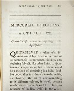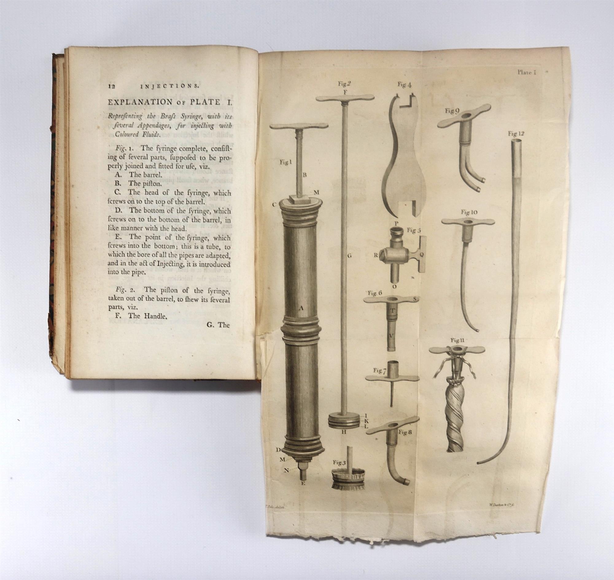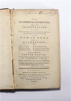 POLE, Thomas. The Anatomical Instructor: or an Illustration of the Modern and Most Approved Methods of Preparing and Preserving the Different parts of the Human Body, and of Quadrupeds by Injection, Corrosian, Maceration, Distention, Articulation, Modelling &c. Pub. LONDON; Printed by Couchman and Fry and sold by the author No. 11 Talbert-Court, Gracechurch-Street and by W Darton and Co No.55 Gracechurch-Street, MDCCXC (1780). Title, pp.[V]-lxxx, [6] leaves, 304pp, [8] leaves :: 19 plates. Last two leaves are Errata, Directions to the binder. An excellent account of the preparation of dissection etc. for muscular use. Pole was a Quaker who practised in London and then in Bristol. Russell British Anatomy 665, ESTC T114732. Bound in quarter leather on marbled boards which are in poor condition with losses to corners, soiled and rubbed. Front hinge loose. Text block top dusted, while the contents are very clean with only the occasional mark or soiling. Minor offsetting of plates, while the folding plates (2) reveal some handling. Previous owners signatures of Dr James Hamilton Jnr, Richard James Berry, Edward Arthur Ford. James Hamilton Jnr. was professor of midwifery in Edinburgh, d.1839. Bookplate: Ex Libris Anatomica K.F. Russell. (210x125mm)