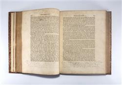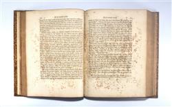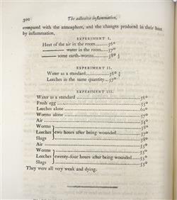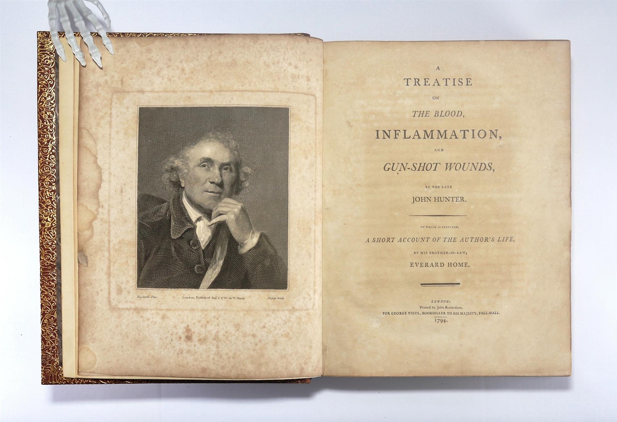 HUNTER, John. A treatise on the Blood, Inflammation and Gun-Shot Wounds. To which is prefixed, a short account of the author's life, by his brother-in-law, Everard Home. LONDON: Printed by John Richardson, for George Nicol, Bookseller to His Majesty, Pall Mall. 1794. First edition. Russell's collation….4° p4 b-h4 i2 B-4D4 ($1 signed) 322 leaves; pp. [2] iii-lxvii [1] 1-575 [1] This is John Hunter's masterpiece, published after his death by Everard Home, his brother-in-law. Hunter gives the first description of the increase in sedimentation rate of the blood which occurs in inflammation. The portrait is by Sharp after Reynolds and dated 1788. Russell had this bound in full light brown morocco, gilt decorated and inside dentelles by Green of Melbourne in 1936. Ligthly aged, spine a little faded. Portrait frontispiece foxed and damp stained, title toned. The great majority of pages have mild text offsetting and occasional foxing. Some pages 121-164 are overtly affected. Final section of 8 plates has damp toning and foxing. There is a small number of pencil underlines, and a long disagreeing notation to the bottom margin of one page. Refer to images. Bookplate, Ex Libris K.F. Russell. (270x210mm)