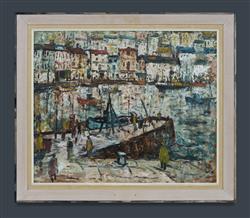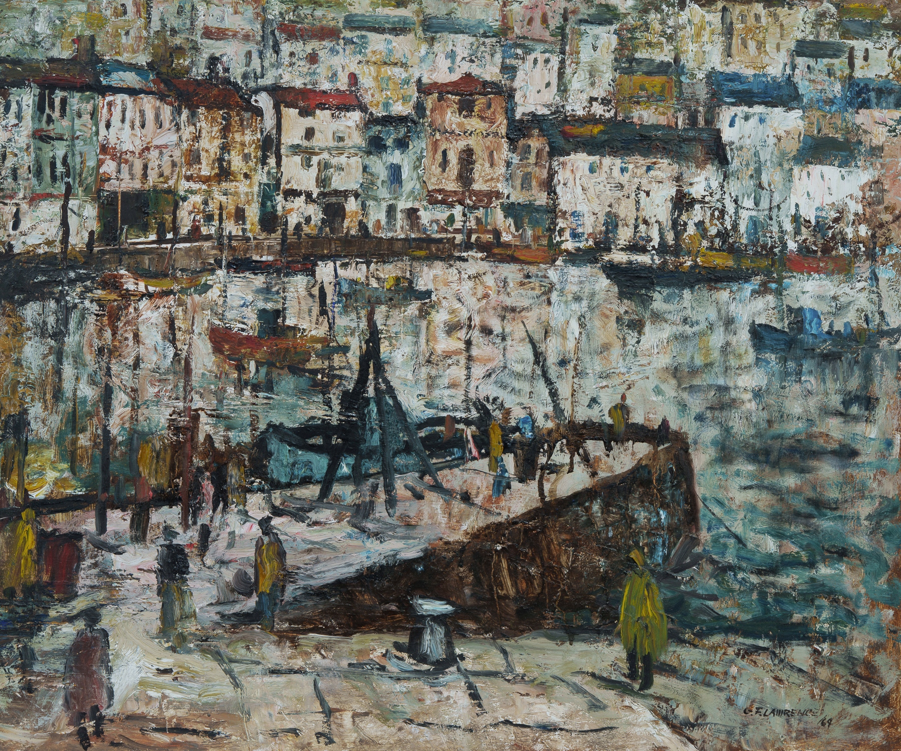 LAWRENCE, George Feather (1901-1981) 'Brixham Inner Harbour [Devon, England]' 1964. Signed and dated lower right. Oil on Board 50x60cm PROVENANCE: The Estate of the Late Douglas Black, Queensland.Estimate $700-1,200