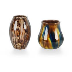McHugh Cream Earthenware Pottery Vase Signed 'H McHugh 1933' with cobalt, yellow, and sepia running glaze. (H.12.5cm). Together with a Bendigo cream stoneware vase featuring Rockingham and cream running glaze, impressed ‘Bendigo Pottery 6B'. (H15.5cm)