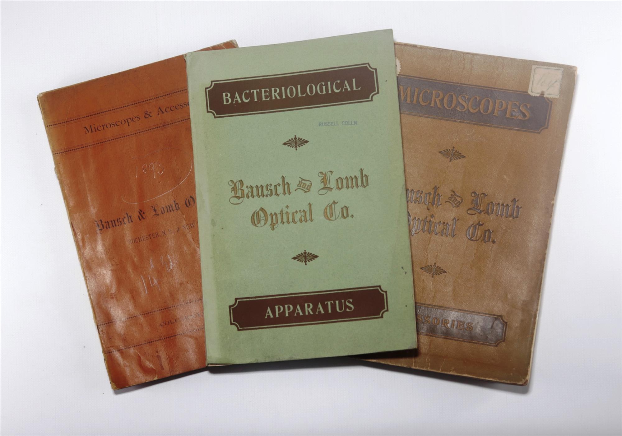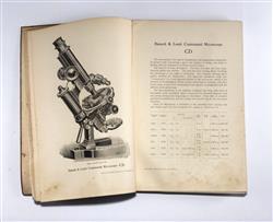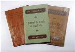 Three Various Bausch & Lomb Optical Co. Catalogues Includes Microscopes and Accessories. 14th Edition prepared for the Columbian Exhibition. 147pp. with 174 illustrations. Poor to fair externally, contents clean & straight. Bacteriological Apparartus. Catalogue E, 1900. Laboratory and pathology items. Fair condition, light water staining and rippling to bottoms of the pages. Microscopes & Accessories. Catalogue A, 16th. Edition. 186pp. Cover in poor condition, initial 20 pages water stained to bottom margin, remainder lightly stained at the bottom edge. (255x170mm)