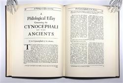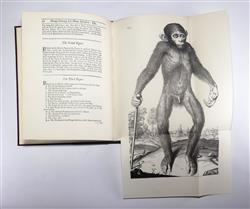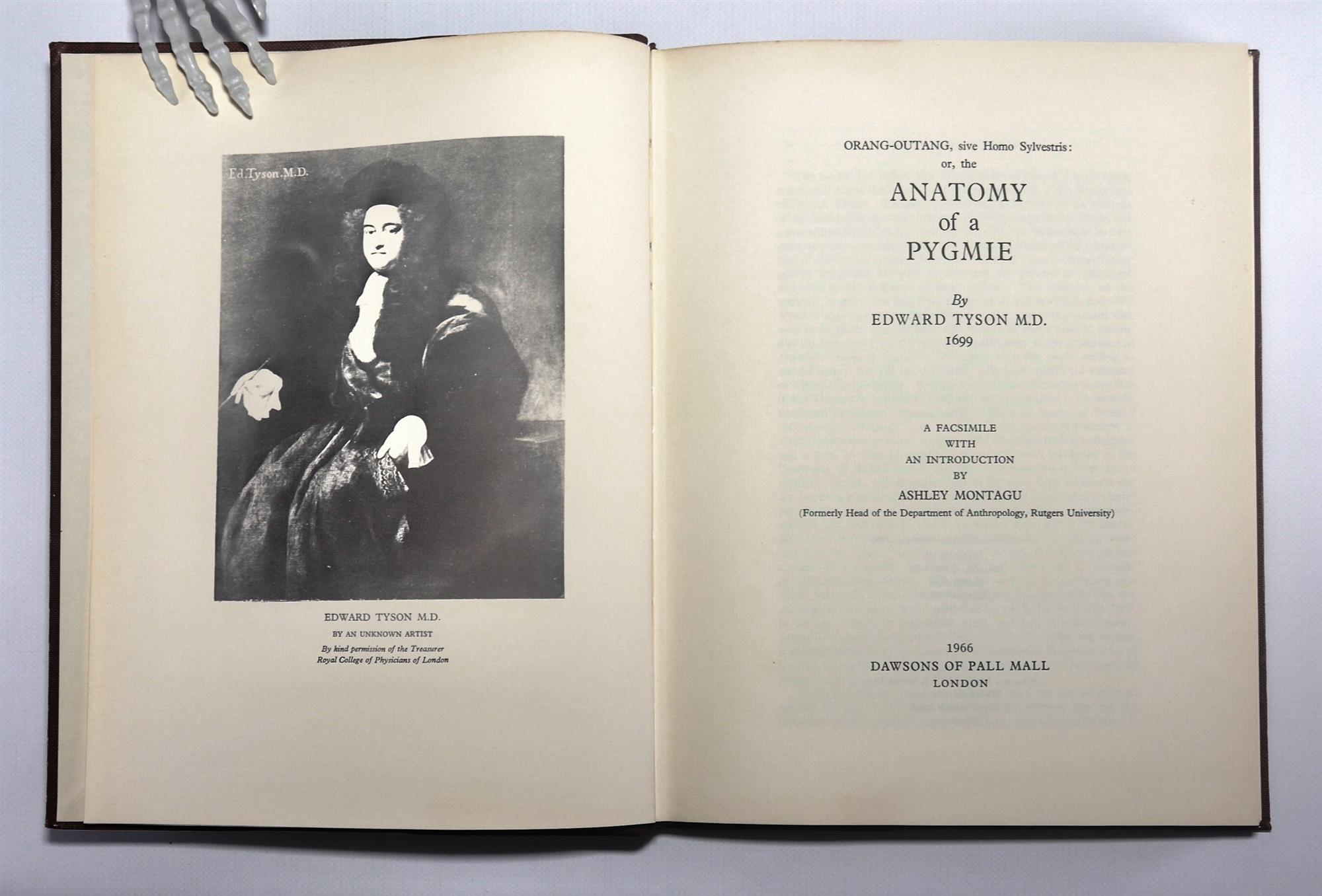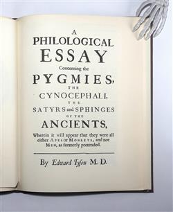 TYSON, Edward. Orang-Outang, sive Homo Sylvestis: or, the Anatomy of a Pygmie compared with that of a Monkey, an Ape, and a Man. To which is added a Philological Essay concerning the Pygmies, the Cynocephali, the Satyrs, and Sphinges of the ancients. Pub. LONDON: Printed for Thomas Bennet at the Half-Moon in St Paul's Church- yard; and Daniel Brown at the Black Swan and Bible without Temple-Bar and are to be had of Mr. Hunt at the Repository in Gresham-Colledge. M DC XCIX. [1699] Facsimile edition, with an introduction be Ashley Montagu, pub. by Dawson's of Pall Mall, 1966. 4° p4 A2 B-O4 P2 A2 B-H4 I2(-1) ($1-2 signed) 91 leaves; pp. [12] 1-108 [2] 1- 58 [2]. Eight folded plates facing pages N4v (3 plates) O1v, O2v, O4v (2 plates), P2v. 'Tysons's orang-outang was, in fact, a chimpanzee yet his account still remains one of the best descriptions of an anthropoid ape that has been published.' (Russell British Anatomy 825) His anatomy of the chimpanzee was the first really important work on comparative morphology. Tyson was the greatest comparative anatomist of his age. The skeleton of his chimpanzee is still in the British Museum (Natural History). 'Plates are engraved by M. van der Gucht from drawings by William Cowper.' (Russell British Anatomy 825) Binding in quarter brown leather with brown buckram, good condition, spine sunned. Contents are clean and unhandled, very good. Bookplate: Ex Libris Anatomica K.F. Russell. (286X225mm)