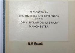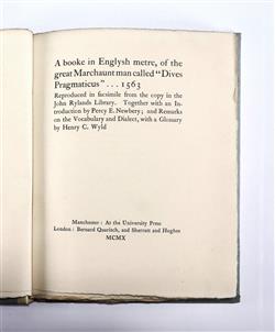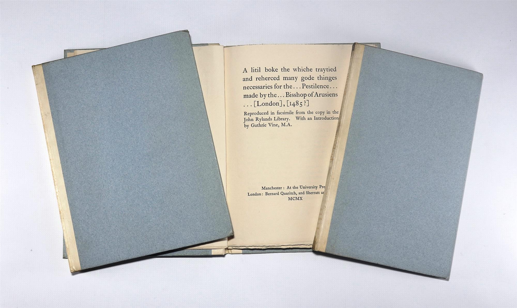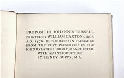 Three John Rylands Library Facsimiles Lot comprises: RUSSELL, John. Propositio Johannis Russell. Printed by William Caxton. [1476] Facsimile of a copy in the John RYLANDS Library, Manchester with introduction by Henry Guppy. MANCHESTER: at the University Press MCMIX [1909]. Half title very toned. NEWBERY, Thomas. A Booke in Englysh metre, of the great Marchaunt man called 'Dives Pragmaticus'. Facsimile of a copy in the John RYLANDS Library, Manchester with introduction by Percy E. Newbery; and remarks on the vocabulary and dialect, with a glossary by Henry C. Wyld. MANCHESTER: at the University Press MCMX [1910] Fly leaf very toned. KNUTSSON, Benget Bishop of Arusiens. Here begynneth a litil boke the whiche traytied and reherced many gode thinges necessaries for the intirmite & grete sekenesse called pestilence the whiche often times enfecteth us. [London] [1485?] Facsimile from the copy in the John Rylands Library. With an Introduction by Guthrie Vine. MANCHESTER: at the University Press MCMX [1910] The first book on medicine to be printed in English. Sudhoff has shown (Arch. Guesch. Med 5. 56-58) that this was written about a century earlier by Papal physician Johannes Jacobi (d 1384) of Montpellier, a friend and colleague of Guy de Chauliac. All 3 uniformly bound in white paper spine with light blue/grey paper boards and uncut pages. Spines and boards a little aged. Contents of all books are clean and straight. 235x180mm (average)