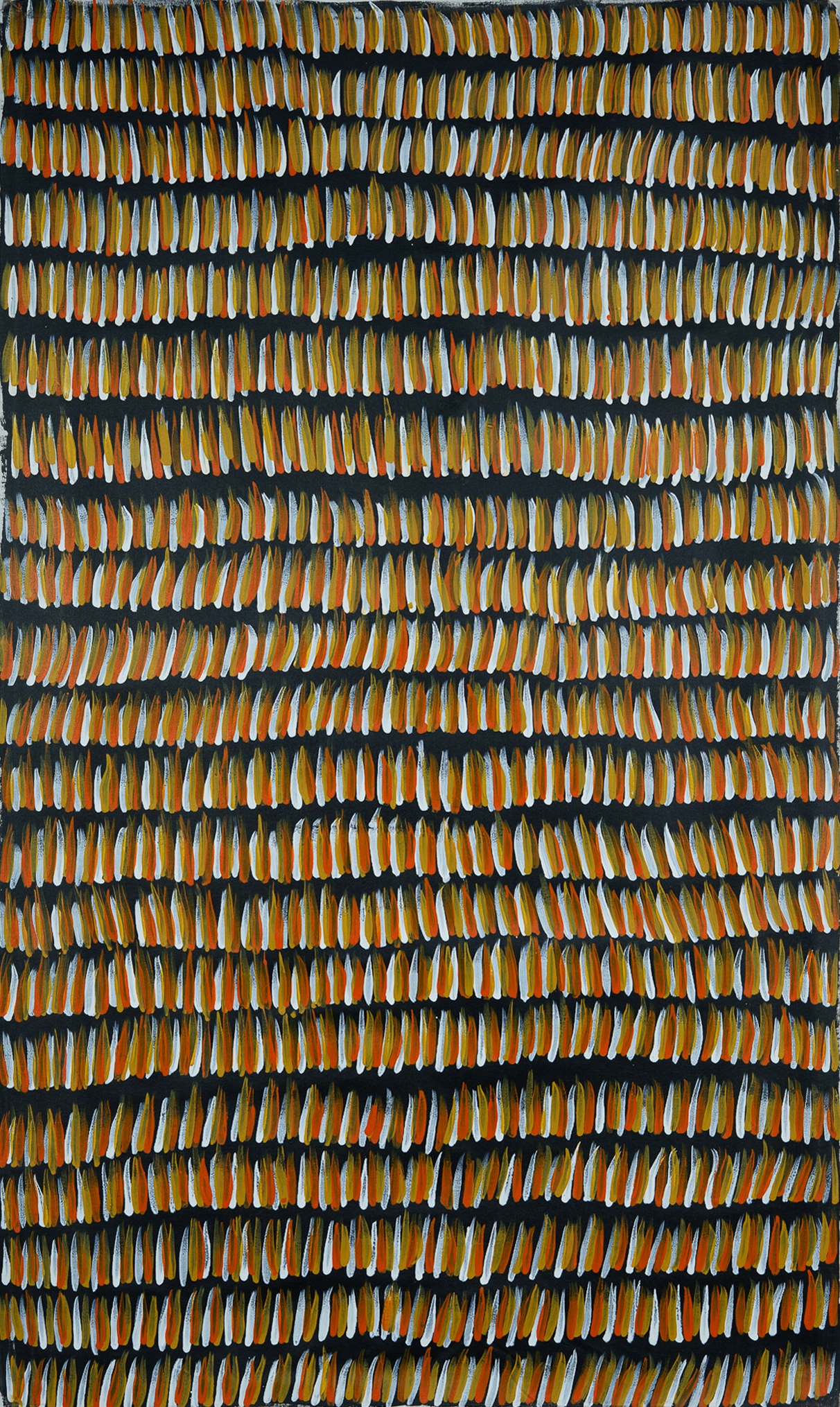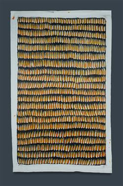 PETYARRE, Margaret Turner Price (Aboriginal 1950-2008) 'Bush Yam Seed,' 2004. Signed and inscribed verso: DBG/HBT TURM 04-0506. Acrylic on Canvas 145x87cm (image) PROVENANCE: Russell Guy, Didgeridoo / Artifacts, NT (certificate of authenticity supplied)Estimate $200-400