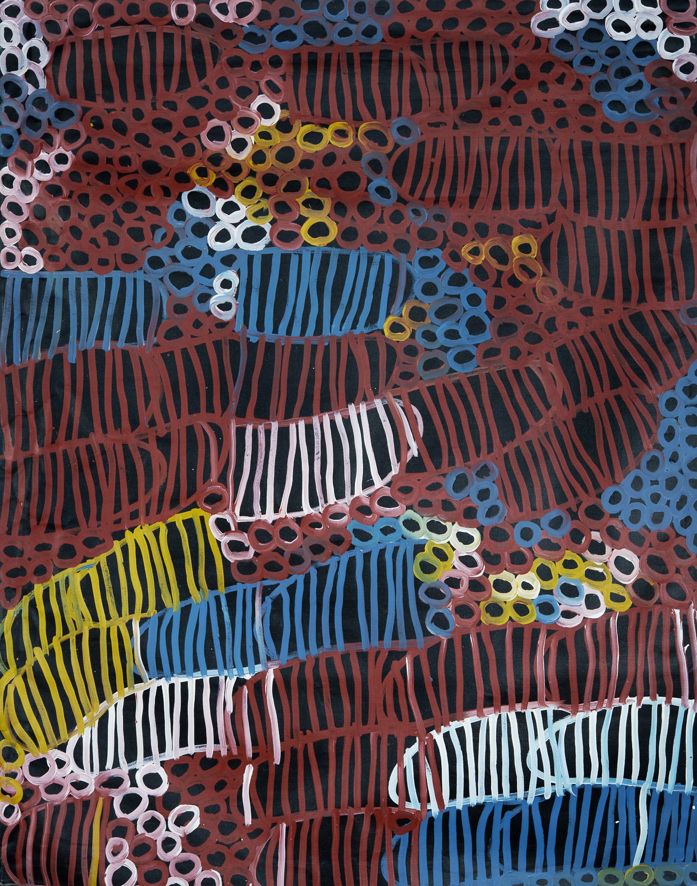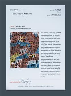 PWERLE, Minnie (Aboriginal 1922-2006) 'Bush Melon,' 2004. Signed and inscribed verso: DBG/PWEM 03-1004. Acrylic on Linen 146x116cm PROVENANCE: Russell Guy, Didgeridoo / Artifacts, NT (certificate of authenticity supplied)Estimate $3,500-4,500