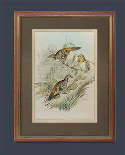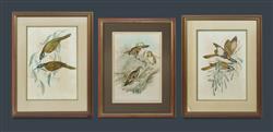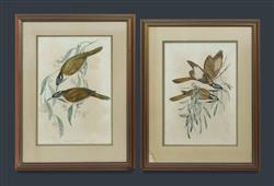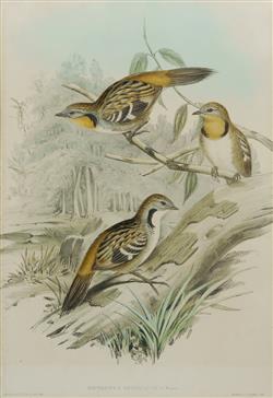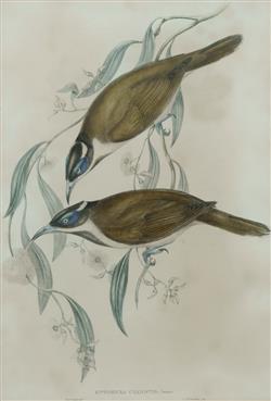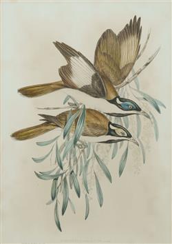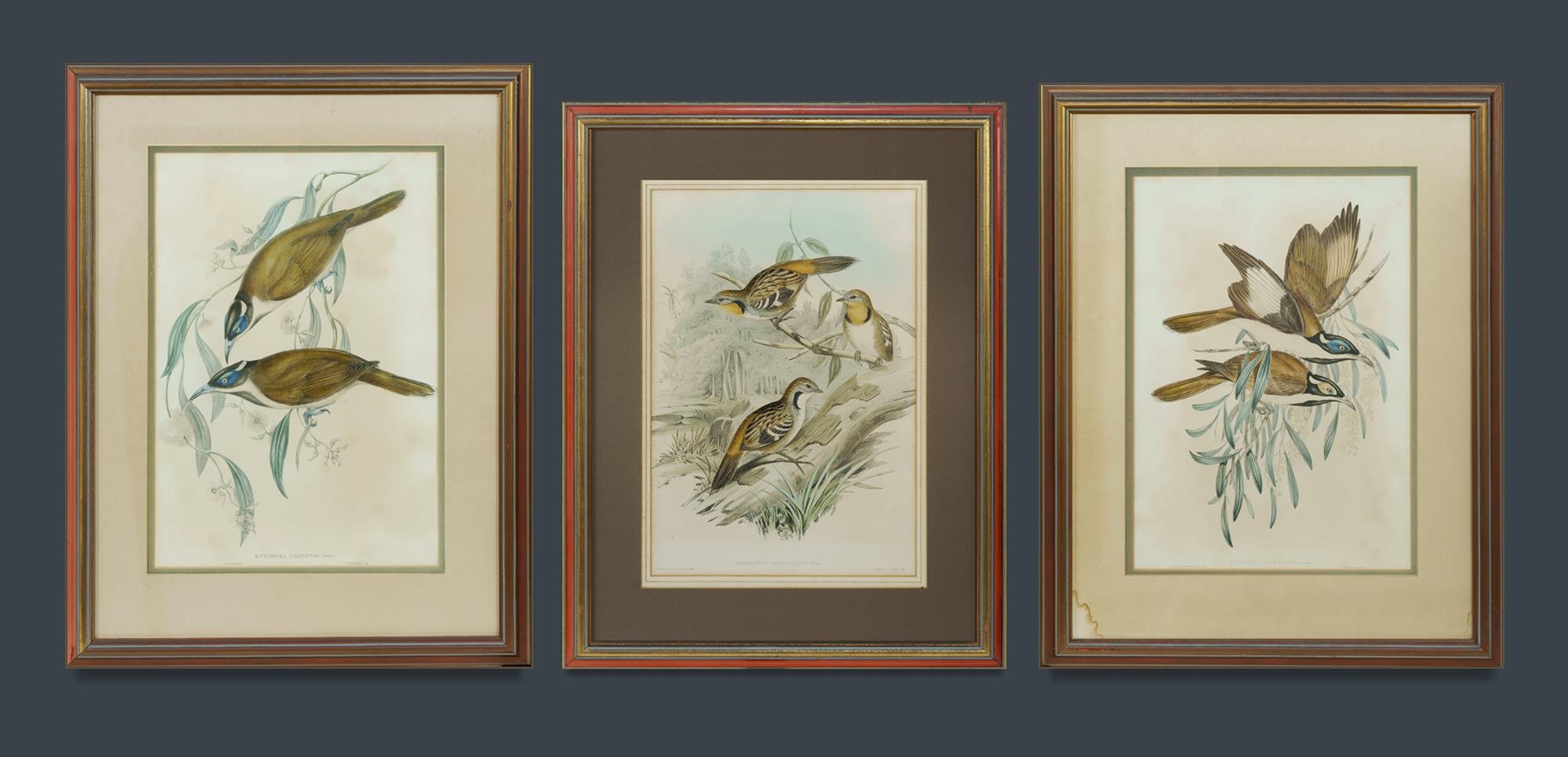 GOULD, John (1804-1881) (3) 'Orthonyx Spinicaudus: Temm (Australian Logrunner)', 'Entomyza Albipennis (White-Pinioned Honeyeater)', and 'Entomyza Cyanotis: Swains (Blue-Faced Honeyeater). Description sheets attached verso for the latter two. Hand Coloured Lithograph (3) 50x34cm (largest)