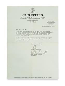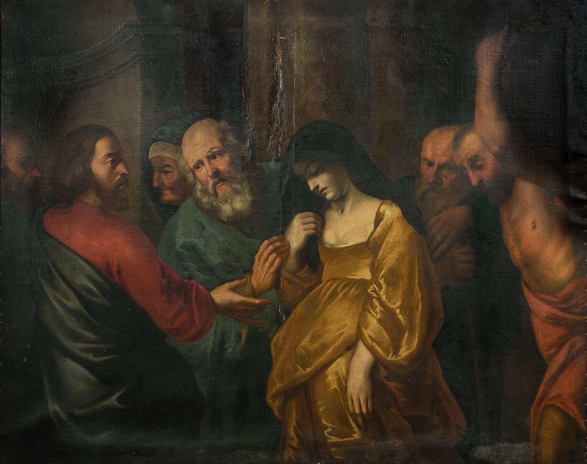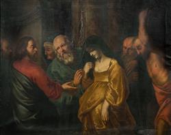 After Peter Paul RUBENS (likely 18th Century) Christ and the Adulteress No signature apparent. Accompanied by letter from Christie's, dated 12th February 1982, stating that the painting, in their opinion, is a 17th century Italian copy. Also accompanied by letter from Dr Marijke van den Brandhof, dated 13th July July 1982, outlining a similar conclusion. Oil on Canvas (lined) 147x184cm (stretcher) 170x206cm (frame)