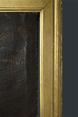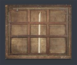 Condition: The canvas is lined and tacked onto the stretcher frame. There is a vertical line of paint losses, running centrally top to bottom, which is likely caused by the cross bar of a prior stretcher frame. Craquelure, consistent with age.