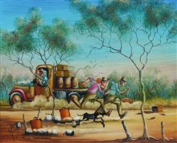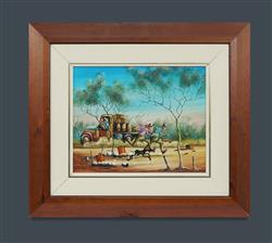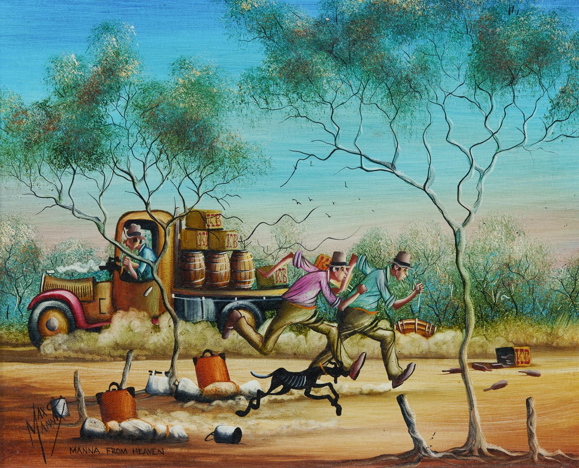 MANNIX, Max (b.1939) 'Manna From Heaven' Signed lower left. Additional signature, sketch and dedication verso. Oil on Canvas on Board 29x36cmEstimate $700-1,100