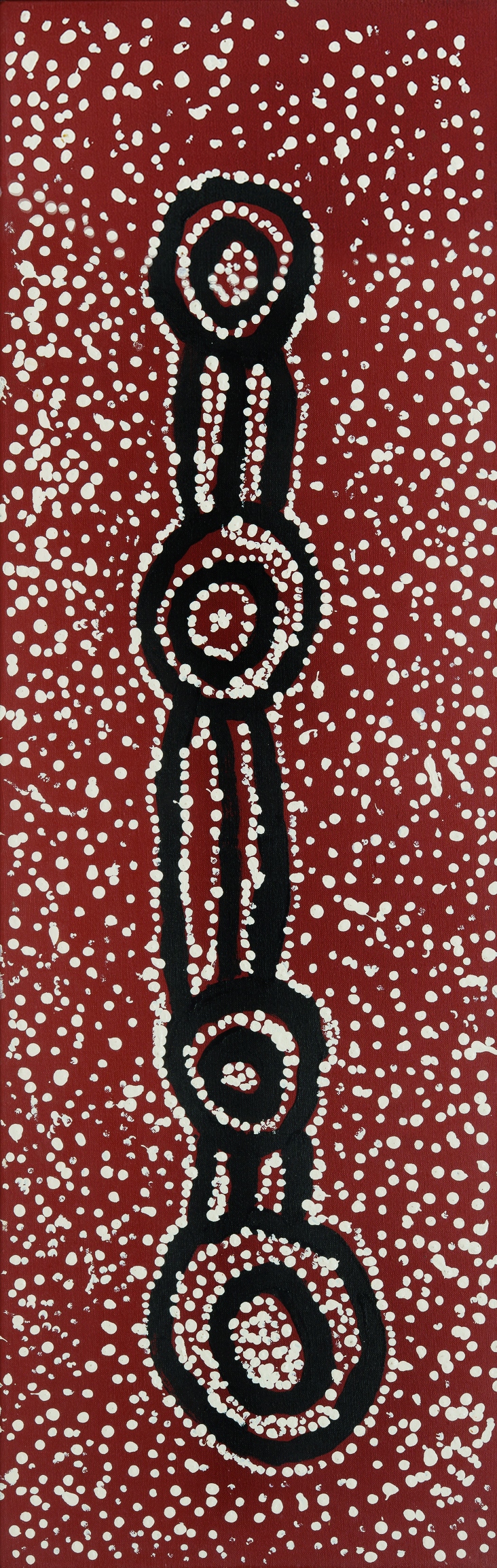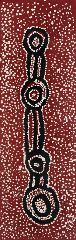 TJAMPITJINPA, Pegleg (Aboriginal 1920-2006) Untitled, 2002. Inscribed verso with artist's name and cat #PT200203. Acrylic on Linen 112x36cm PROVENANCE: Yanda Aboriginal Art, NT (stamp verso); Ken Hinds Cultural Heritage Collection, Qld.Estimate $800-1,500