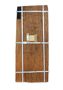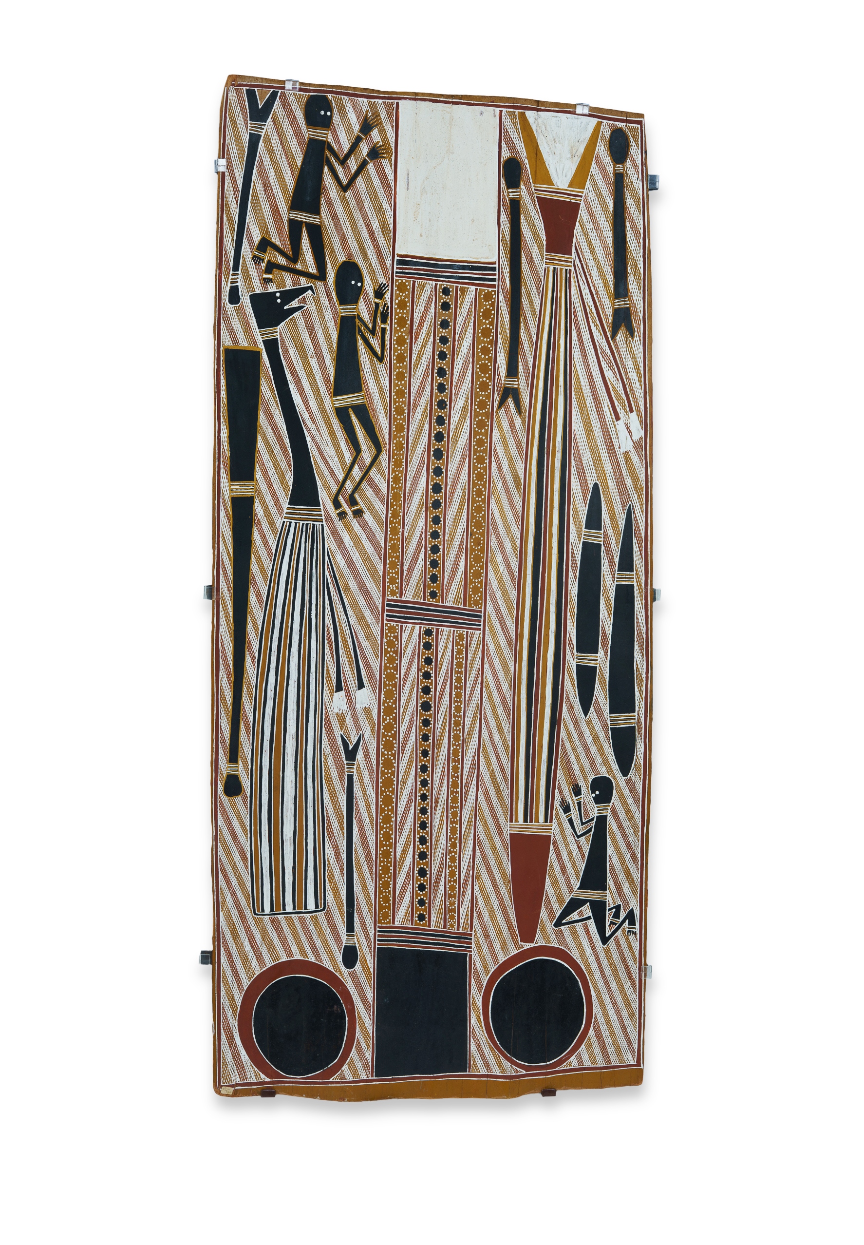 MILPURRURRU, George (Aboriginal 1934-1998) 'Mudukuntja Hollow Log Ceremony,' 1986. Well inscribed verso inc. cat #2WSS786/18. Painted at Milingimbi, Central Arnhem Land. Natural Earth Pigments on Bark 136x60cm