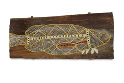 Aboriginal School Barramundi Likely Croker Island or Maningrida, c.1960s. Natural Earth Pigments on Bark 94x42cm PROVENANCE: Private collection, Canberra.Estimate $400-700