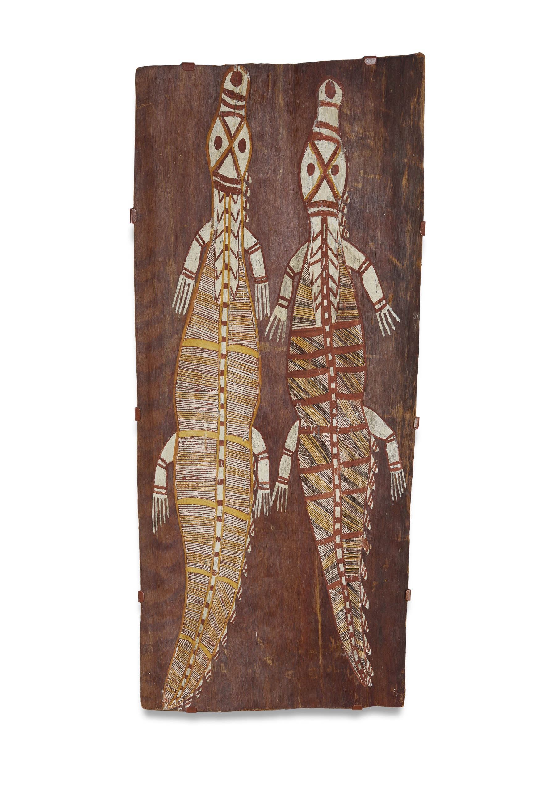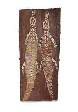 Attrib. NANGUNYARRI, January (Aboriginal 1901-1972) Two Crocodiles Inscribed verso. Natural Earth Pigments on Bark 100x53.5cm PROVENANCE: Jim A Davidson, Melbourne (1960s); The Joan and Robert Rowland Collection, Melbourne; private collection, Canberra.Estimate $500-800